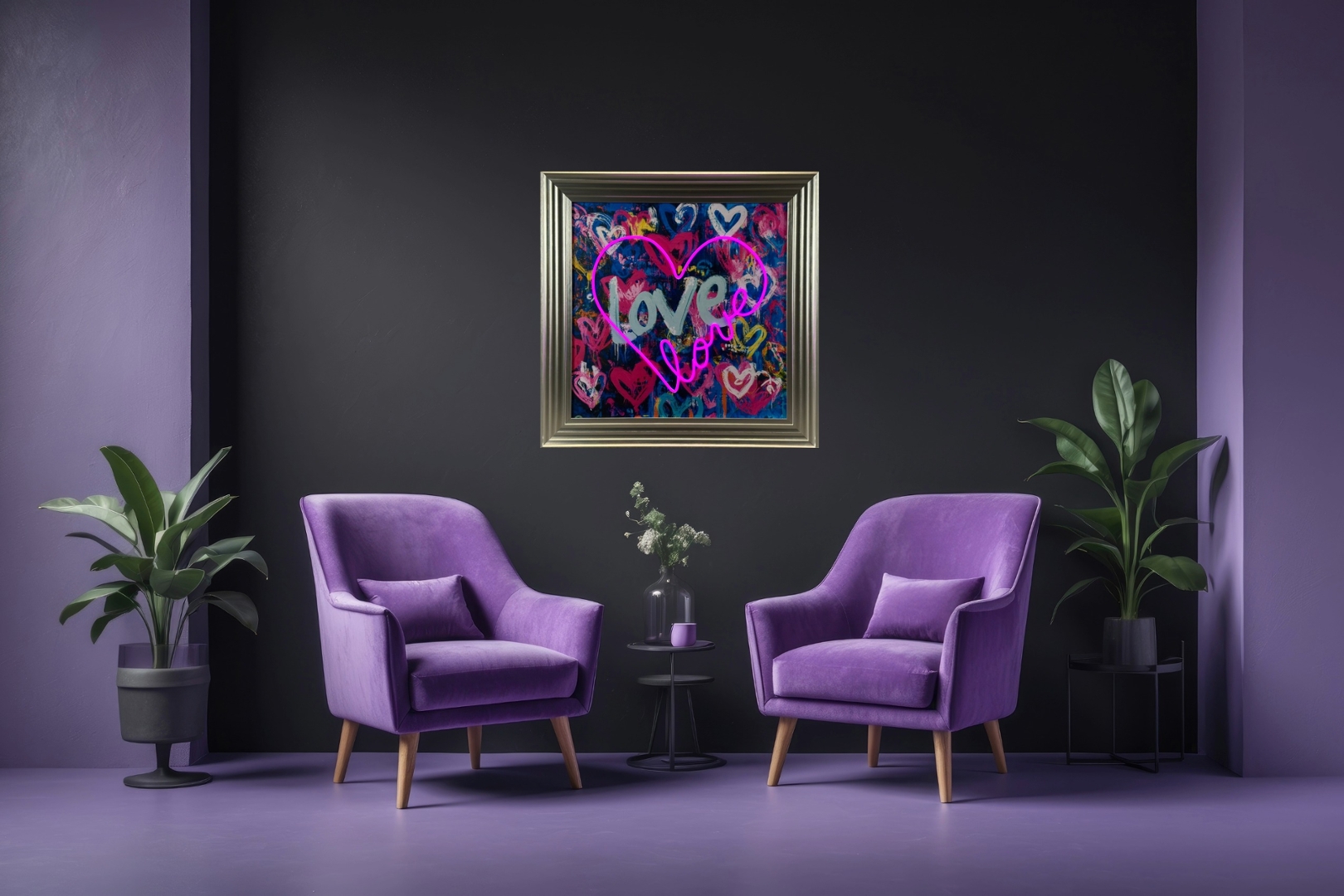 A brand new silver framed LED wall art picture of Love Hearts. This picture features a discreet power button at the bottom of the frame and a hidden battery pack.
