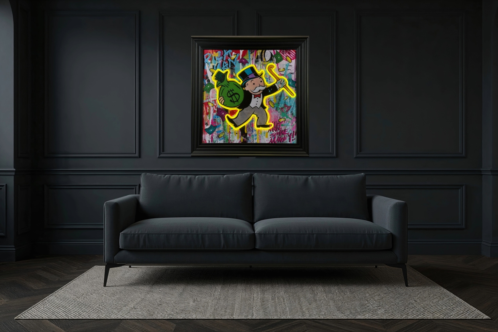 - > Framed LED Wall Art Picture of The Monopoly Man Carrying his Money