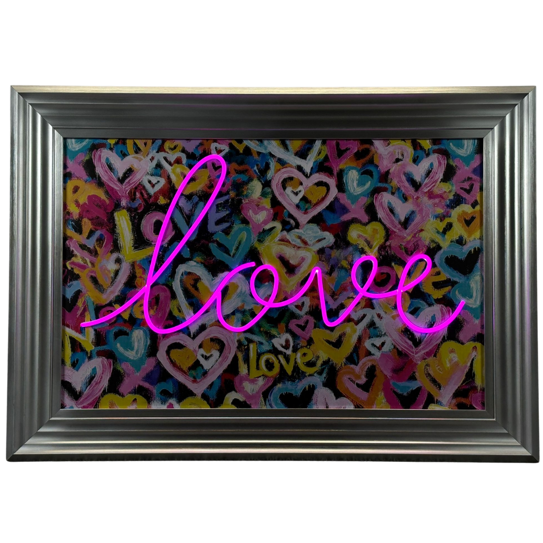 A brand new silver framed LED wall art picture titled Love. This picture features a power button at the bottom and a battery pack.