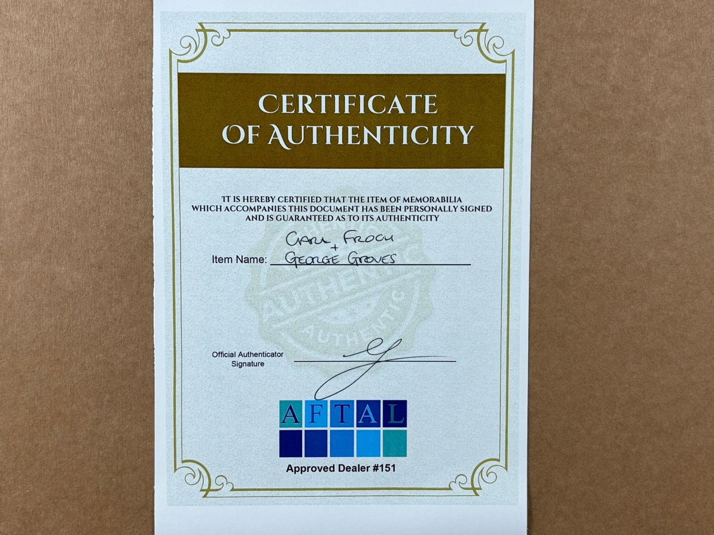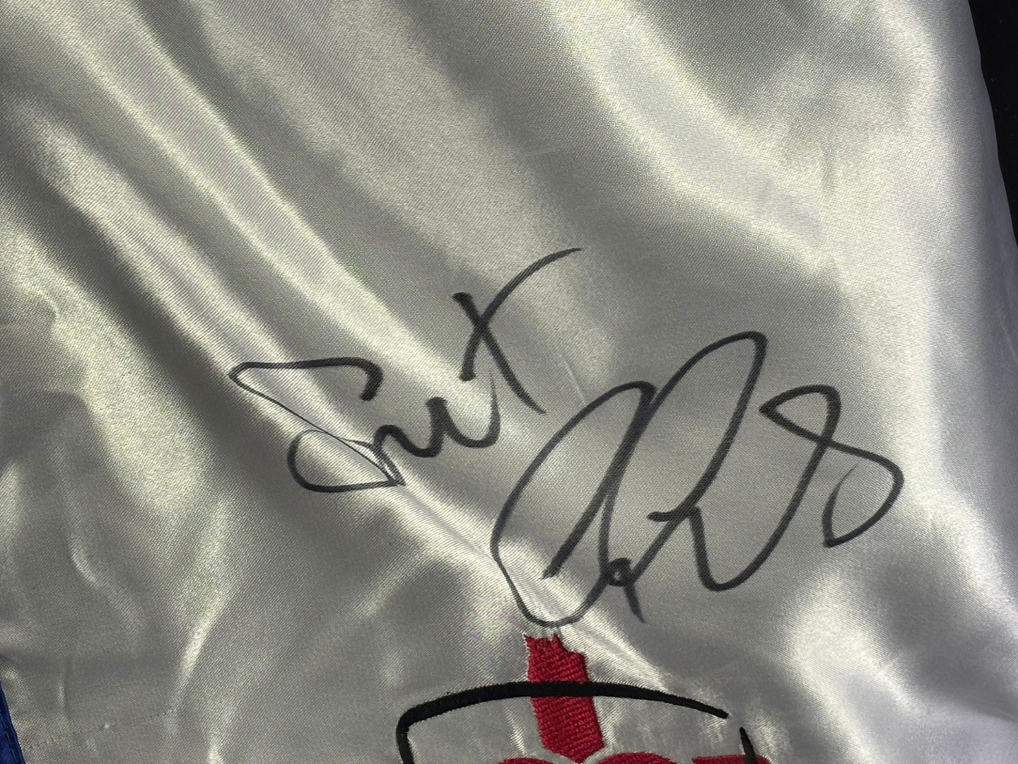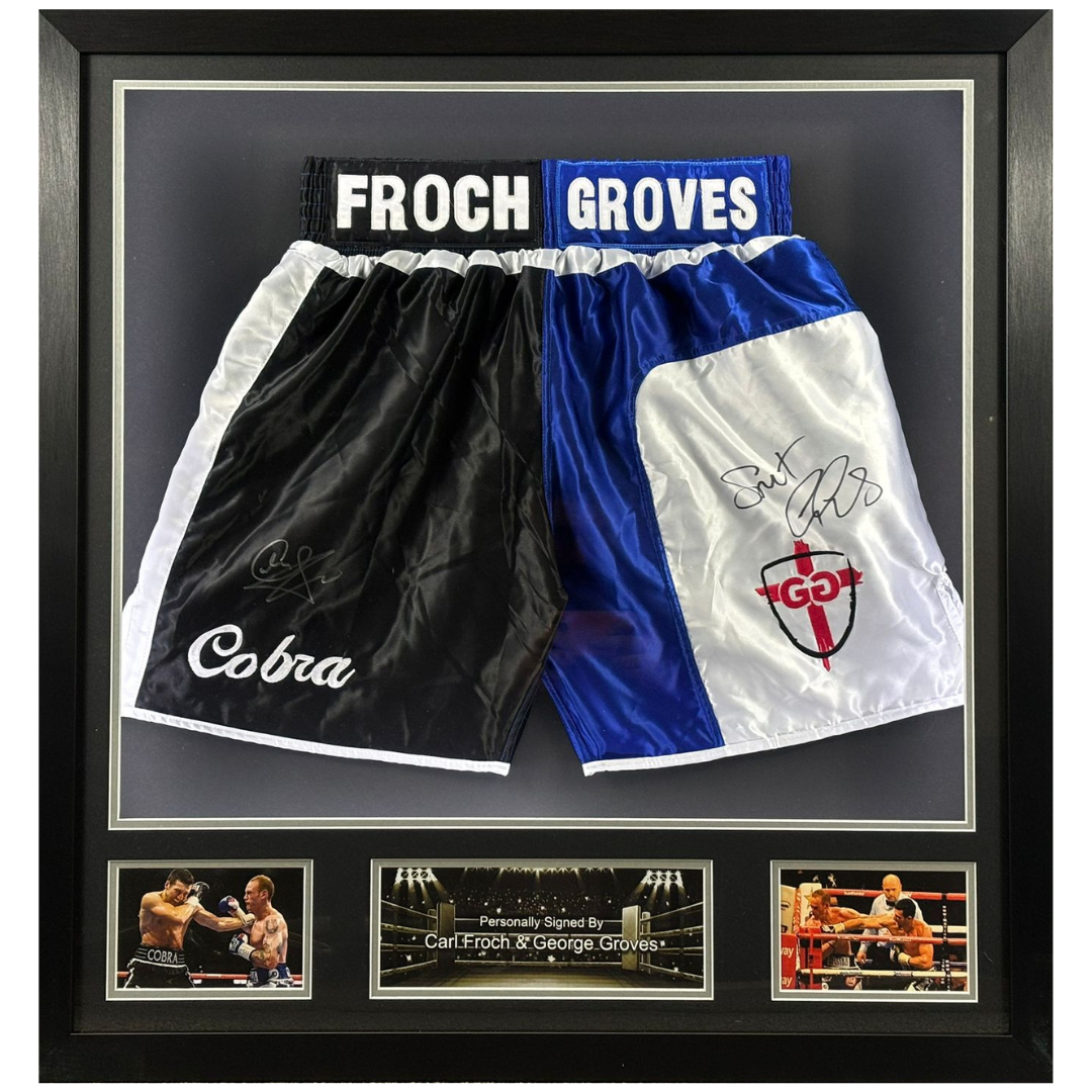 A signed and authenticated Cark Froch & George Groves Boxing Shorts in a presentation frame. Approx 89cm height, 83cm width.