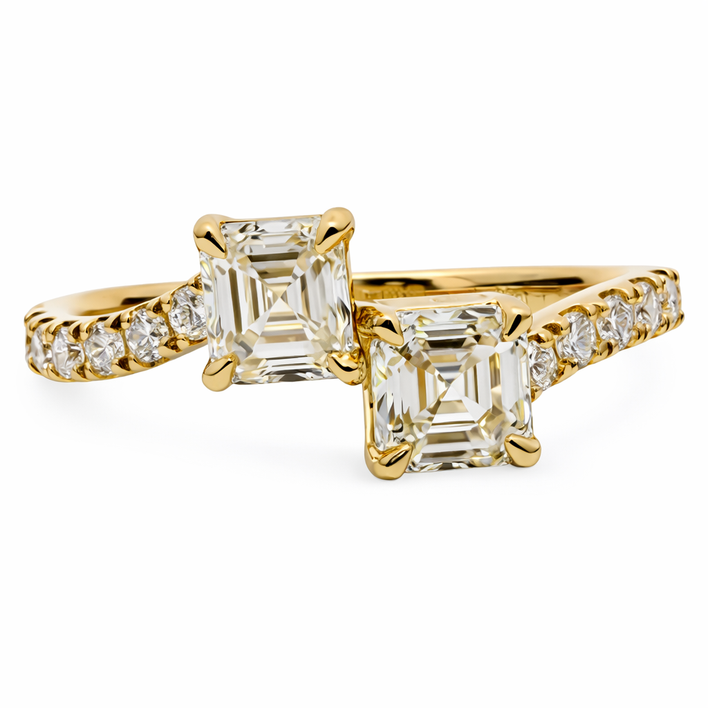 A brand-new, unused GIA-certified natural diamond toi et moi cluster ring, set with two Asscher-cut diamonds at the centre and a cluster of brilliant-cut diamonds to the shoulders, mounted in 18ct yellow gold. The principal stones, with a combined weight of 1.03 ct, display the refined step-cut faceting that defines the Asscher cut, offering depth, symmetry, and a distinctive hall-of-mirrors effect. The toi et moi arrangement brings a sense of balance and symbolism, while the brilliant-cut shoulder diamonds introduce a lively contrast in sparkle.