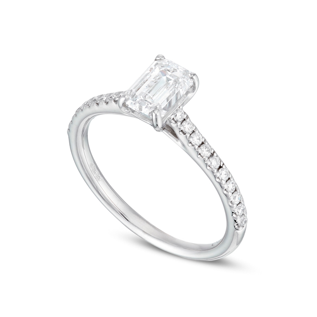 The 18ct white gold setting offers a clean, contemporary finish that pairs effortlessly with the linear geometry of the emerald-cut diamond, creating a balanced and sophisticated profile. Weighing 2.60g, the ring is both lightweight and refined, designed for comfortable wear while maintaining a luxurious presence on the hand. Its timeless styling ensures lasting appeal across changing trends.