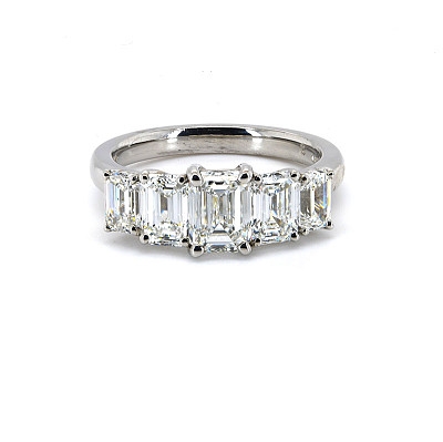 The diamonds have a total weight of 2.51 carats and are beautifully matched in quality, ranging between VS1 and VS2 clarity, with an exceptional F colour grade. Their crisp, near-colourless appearance enhances the emerald cut's clean lines, giving this ring a refined, contemporary allure.