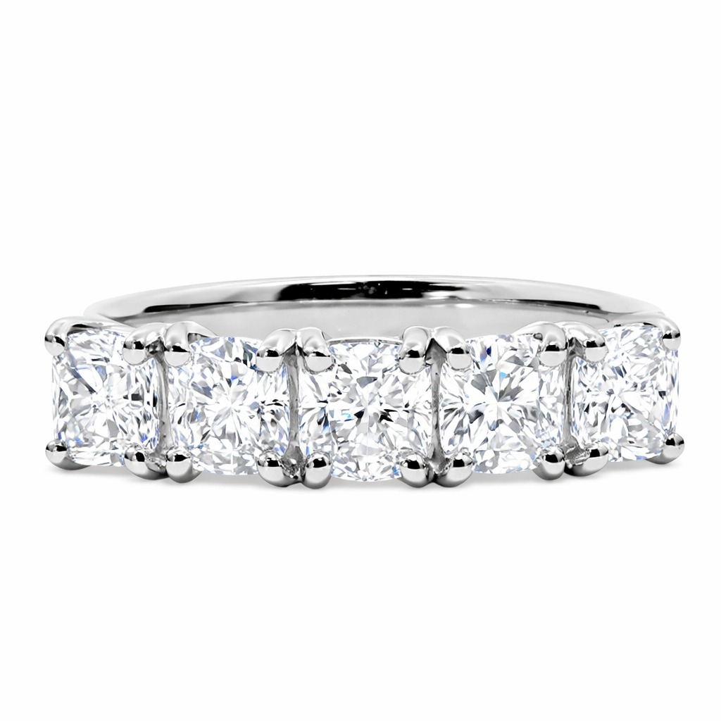 A brand-new, unused, GIA-certified natural diamond five-stone eternity ring, set with five cushion-cut diamonds, set in platinum.