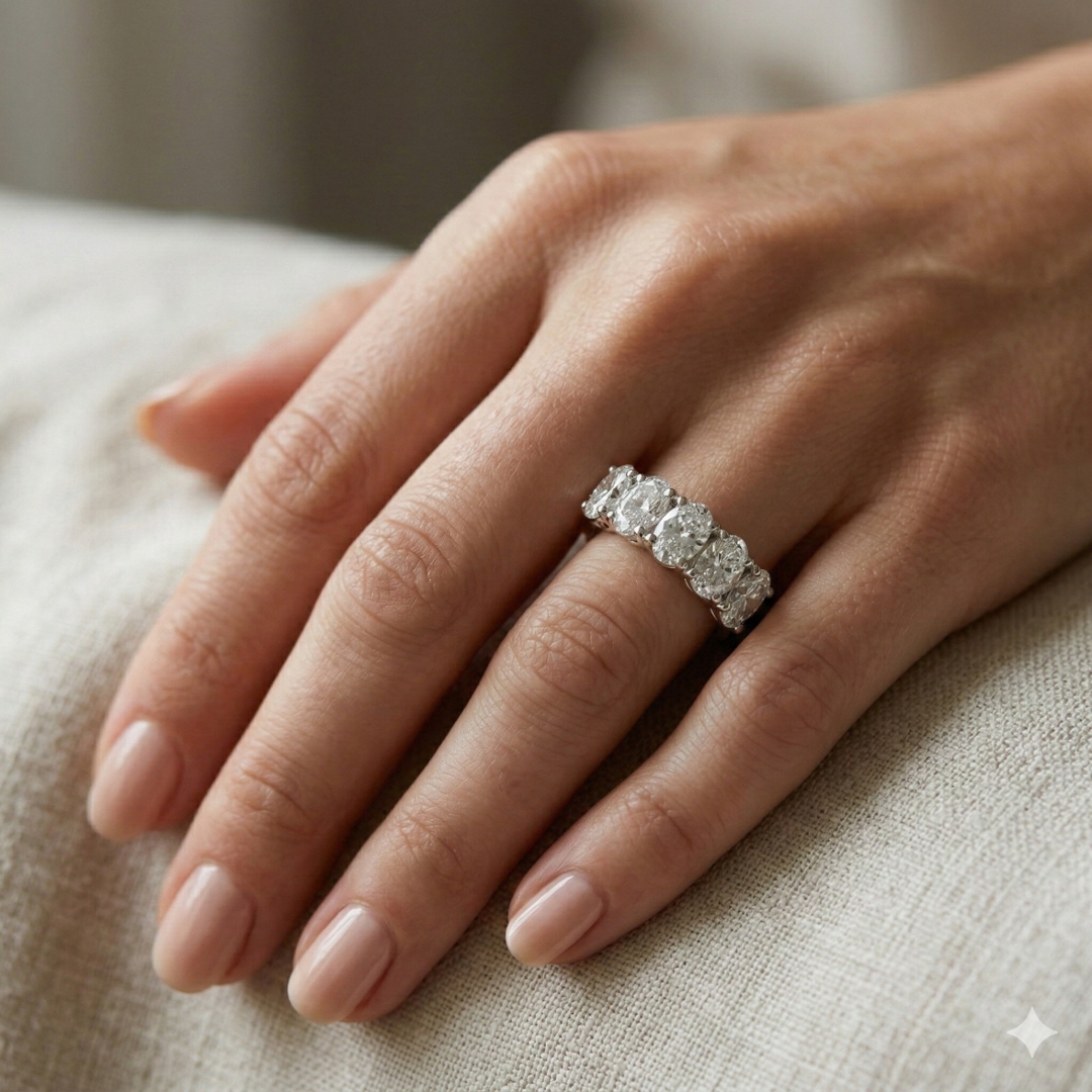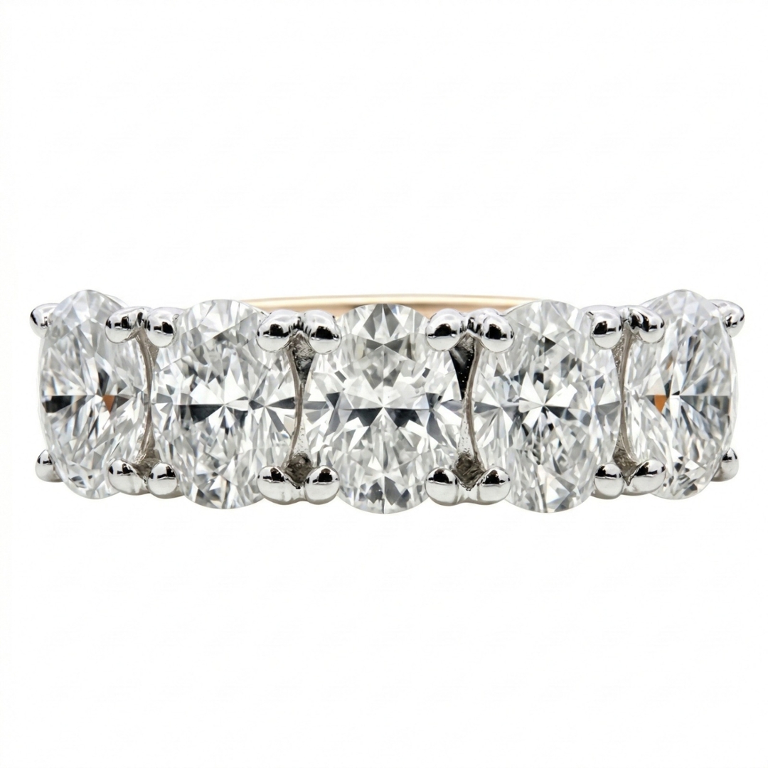 A brand-new, unused GIA-certified natural diamond five-stone eternity ring, showcasing an exceptional total diamond weight of 2.55ct. This striking piece features five beautifully matched oval-cut diamonds, each hand-selected for their bright F–G colour and impressive SI1 clarity. The elongated oval silhouettes create a flattering, elegant spread across the finger, delivering maximum brilliance and presence with refined sophistication.