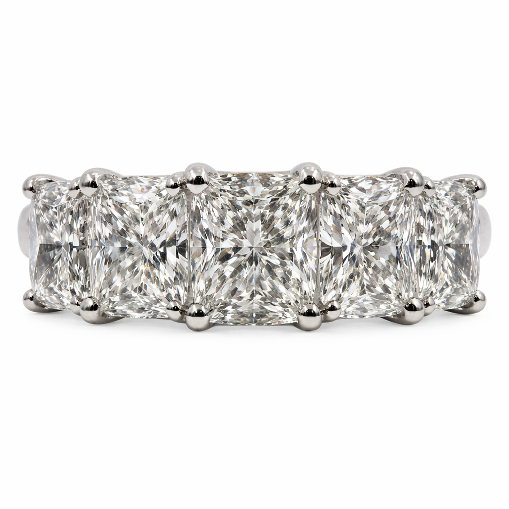 A brand-new, unused, GIA-certified natural diamond five-stone eternity ring, with five radiant-cut diamonds, set in platinum.