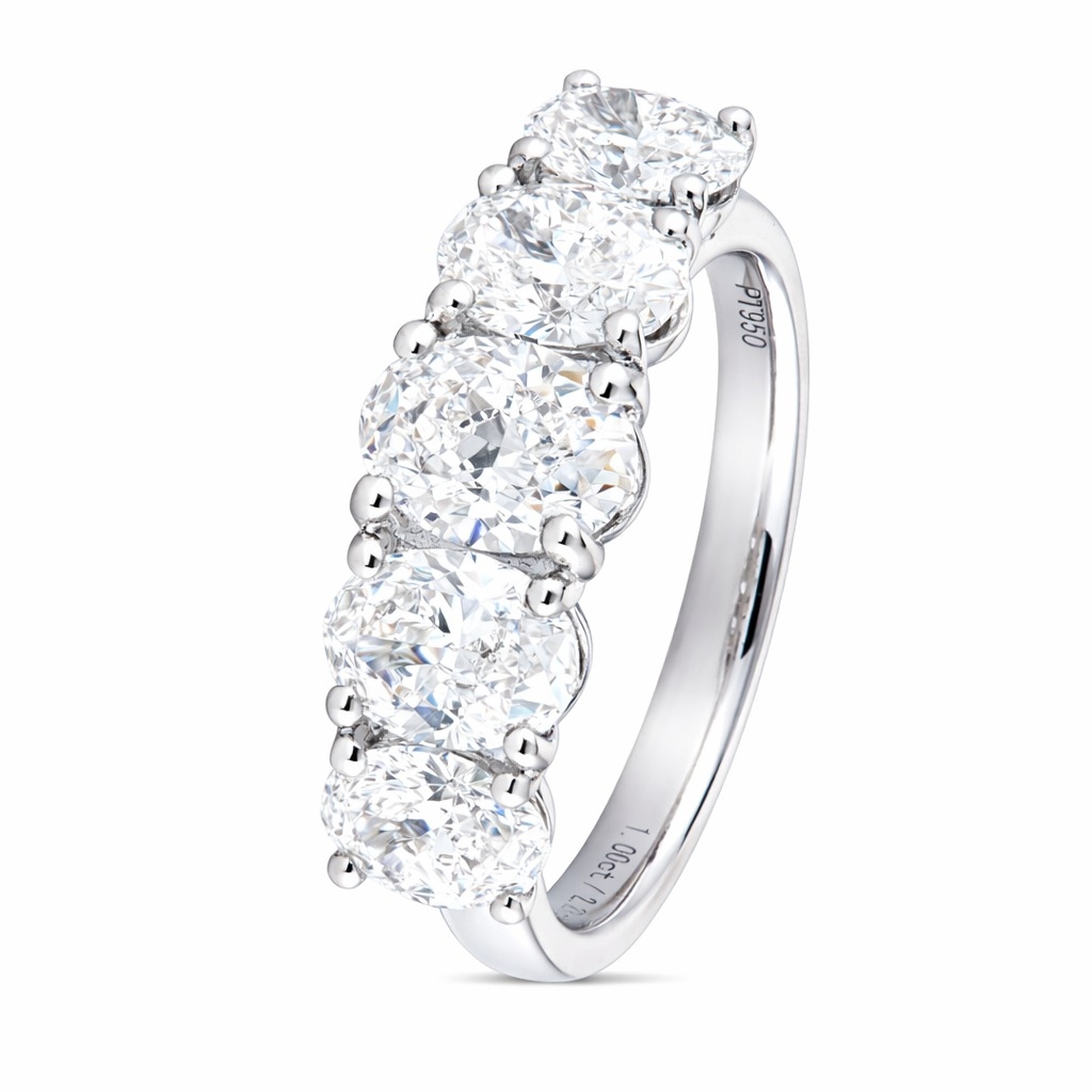 A brand-new, unused GIA-certified natural diamond five-stone eternity ring that epitomises timeless luxury and exquisite craftsmanship. This remarkable piece features five oval-cut natural diamonds, meticulously set in a sleek platinum band. With a total diamond weight of 3.23 carats, each stone is perfectly matched in brilliance, graded F–G in colour and SI1 in clarity, showcasing exceptional sparkle and fire. The oval cuts enhance the diamonds’ natural radiance, creating a seamless display of light that symbolises eternal love and unity. Their natural origin ensures a uniqueness and authenticity that only earth-formed diamonds can provide, making this ring a true celebration of beauty and rarity.