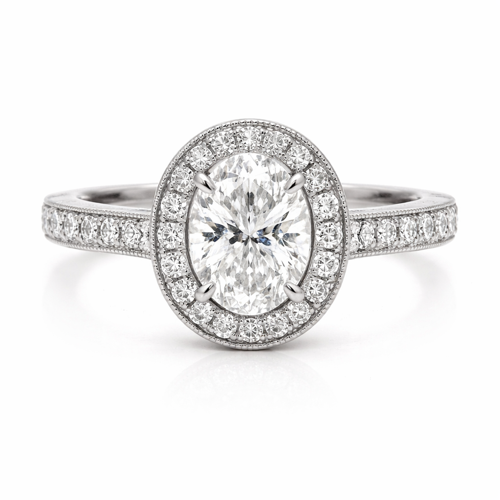 A brand-new, unused GIA-certified natural diamond solitaire engagement ring that blends elegant sparkle, refined proportions, and the enduring qualities of genuine diamonds. At its centre sits a 0.70ct oval-cut natural diamond graded F in colour and SI2 in clarity, offering a bright, near-colourless appearance with lively brilliance that catches the light beautifully along its elongated facets. The oval shape provides a graceful, flattering presence, giving the ring a confident yet timeless focal point. Surrounding the centre stone is a halo of natural brilliant-cut diamonds, with additional diamonds set along the shoulders, bringing the supporting diamond weight to 0.29ct. These natural diamonds contribute a crisp, delicate sparkle and carry the strong appeal associated with genuine mined stones, valued for their authenticity, rarity, and long-established desirability in fine jewellery.