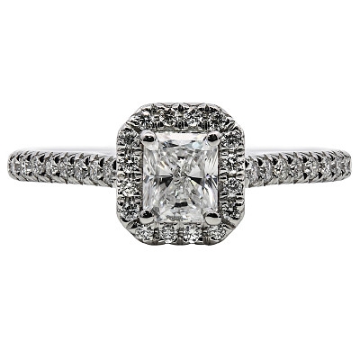 A brand-new, unused natural diamond solitaire engagement ring presented in immaculate condition, showcasing a beautifully proportioned radiant-cut diamond weighing 0.50ct at the centre. Graded D for colour and VS2 for clarity, the principal stone displays exceptional whiteness, sharp brilliance, and a lively presence that performs superbly under all lighting conditions. A halo and shoulder arrangement of brilliant-cut diamonds, totalling 0.26ct, frames the centre stone with refined sparkle, enhancing both depth and visual impact without overwhelming the design.
