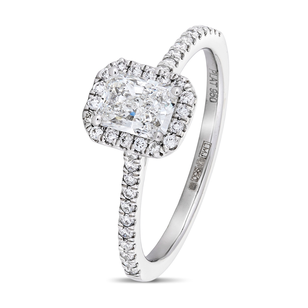 A brand new, unused GIA-certified natural diamond solitaire engagement ring set with one radiant-cut diamond to the centre & a cluster of brilliant-cut diamonds in a halo setting & to the shoulders, set in platinum.