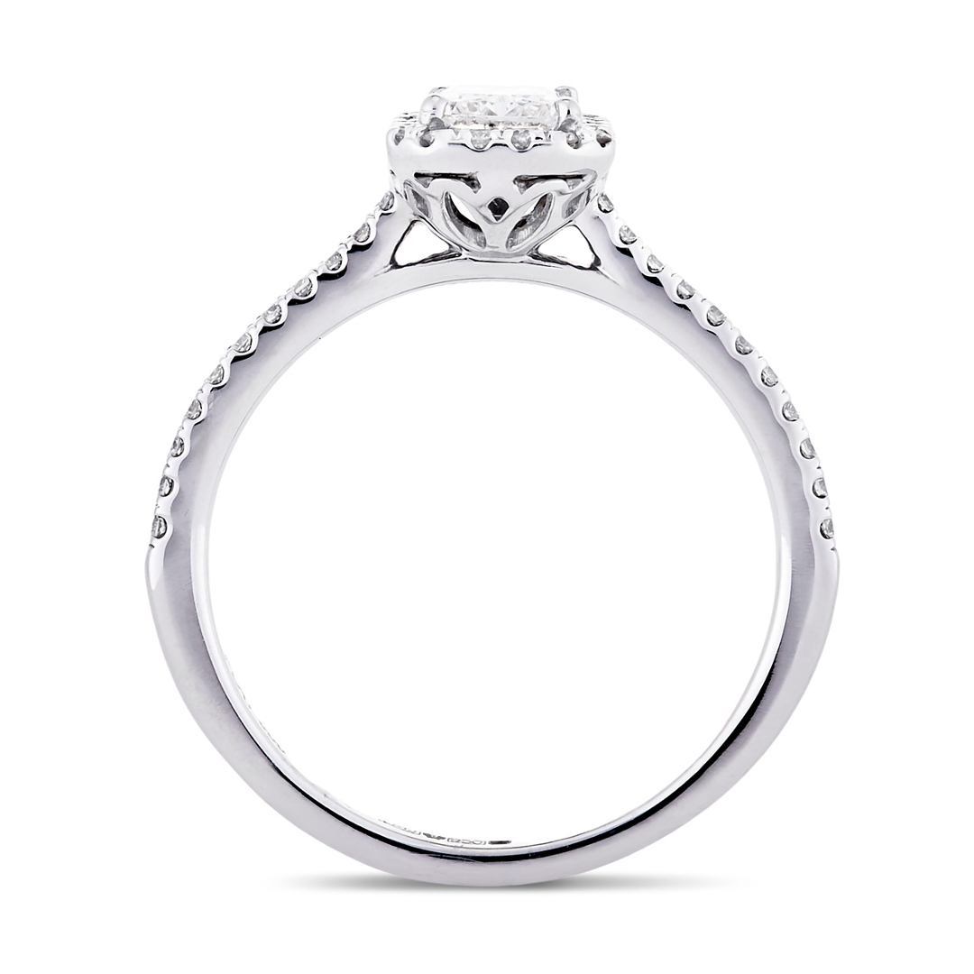 A shimmering halo of brilliant-cut diamonds, artfully arranged to create a captivating frame that amplifies the sparkle and enhances the central diamond. Additional brilliant-cut diamonds extend along the shoulders, adding graceful continuity and extra brilliance. These accent stones total 0.19ct and are graded H-I in colour and VS-SI in clarity, contributing a refined sparkle that perfectly complements the radiant centre.