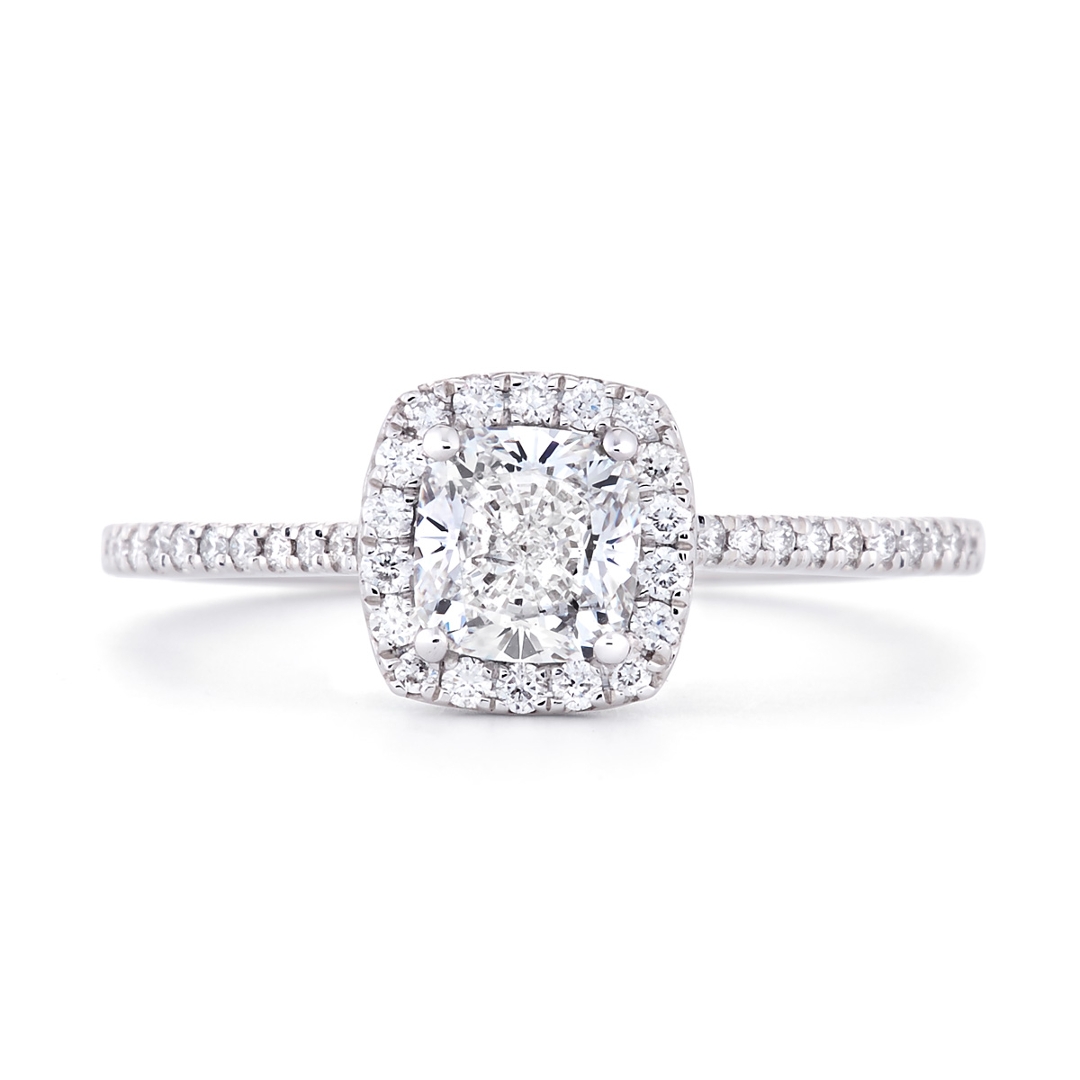 A brand new, unused GIA-certified platinum natural diamond solitaire engagement ring set with one radiant-cut diamond to the centre & a cluster of brilliant-cut diamonds in a halo setting & to the shoulders.