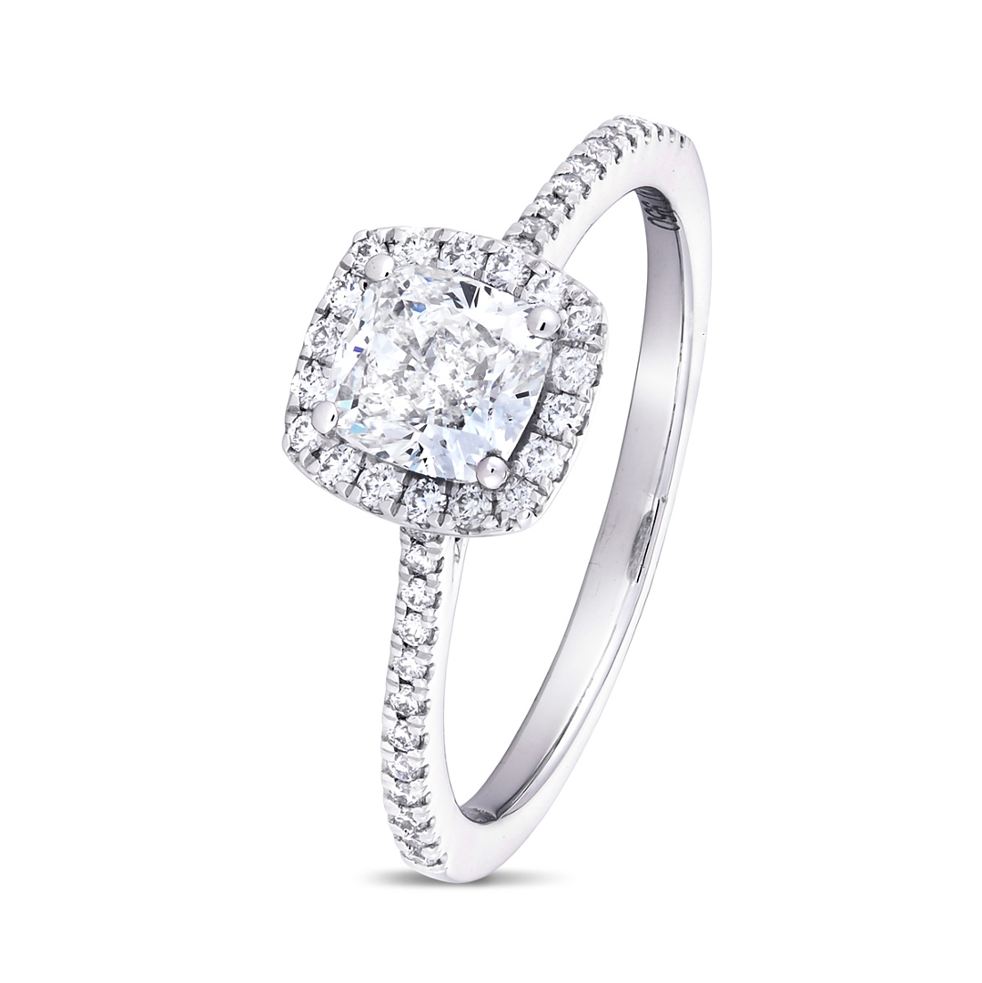 A brand new, unused GIA-certified platinum engagement ring, this stunning piece is a true celebration of natural beauty and refined design. At its heart lies a 0.80ct radiant-cut natural diamond, gleaming with G colour and SI2 clarity, offering impressive fire and brilliance. Surrounding the centre stone is a delicate halo of brilliant-cut diamonds, with additional stones flowing along the shoulders. These accents total 0.18ct and are graded SI1–SI2 clarity and F–G colour, creating a vibrant, light-catching display from every angle. The platinum setting lends a sleek, enduring quality that perfectly complements the sparkle of the diamonds.