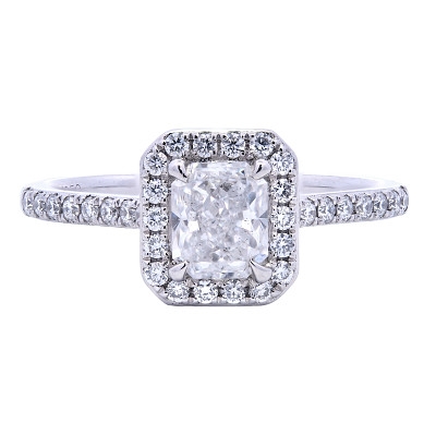 A brand-new, unused GIA-certified natural diamond solitaire engagement ring, with one radiant-cut diamond to the centre & a cluster of brilliant-cut diamonds in a halo setting & to the shoulders, set in platinum.