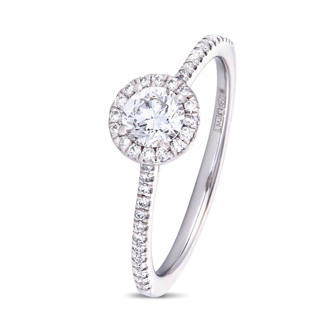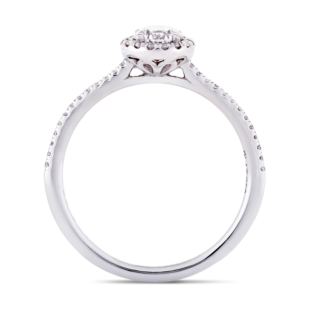 Surrounding the centre diamond is a delicate halo of brilliant-cut diamonds, artfully arranged to enhance the overall shimmer and create a sense of depth and dimension. These dazzling stones continue along the shoulders, forming a graceful cluster that complements the central gem. The additional diamonds have a combined weight of 0.17ct, with G-H colour and SI1-SI2 clarity, delivering subtle sparkle and refinement from every angle.