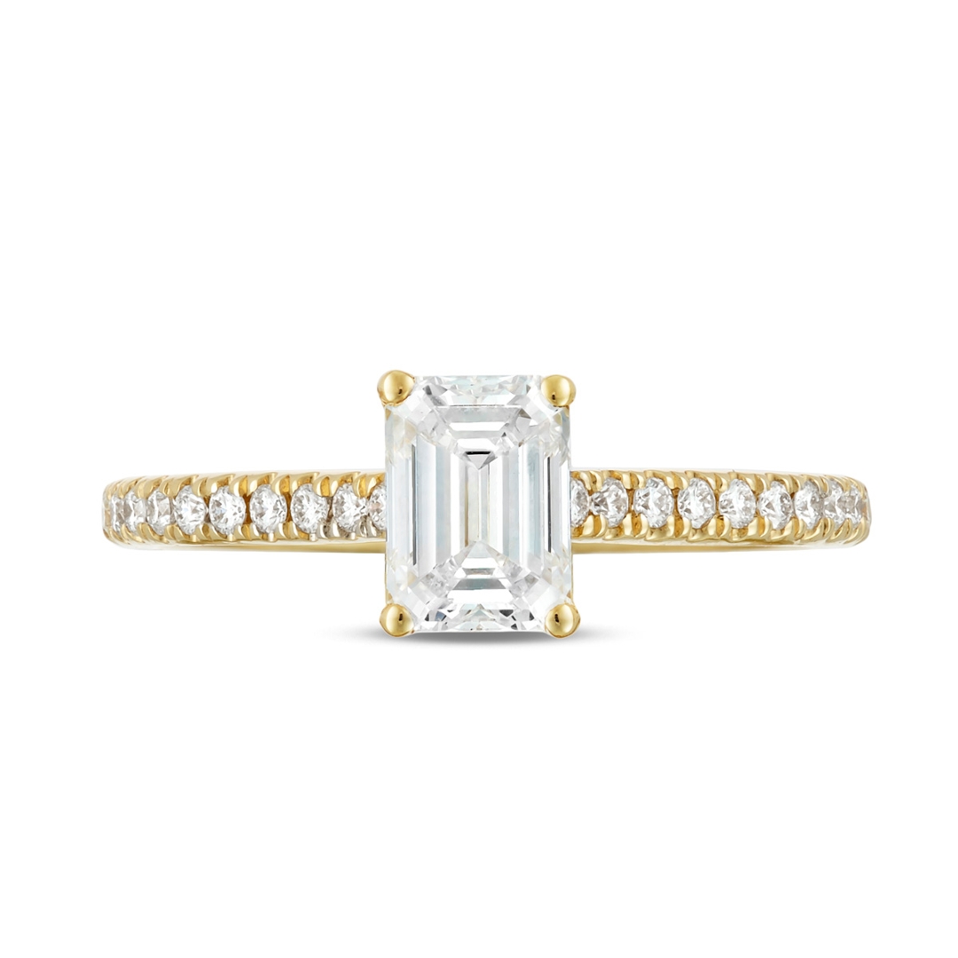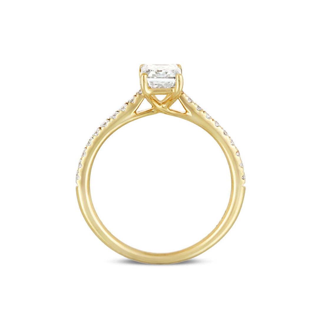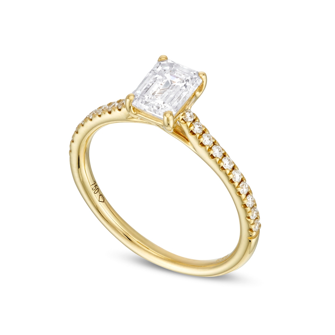 The 18ct yellow gold setting introduces a warm, classic tone that contrasts beautifully with the structured geometry of the emerald-cut diamond, creating a balanced and sophisticated aesthetic. With a total weight of 2.71g, the ring is lightweight yet well-crafted, designed for comfortable daily wear while maintaining a refined and timeless presence on the hand.