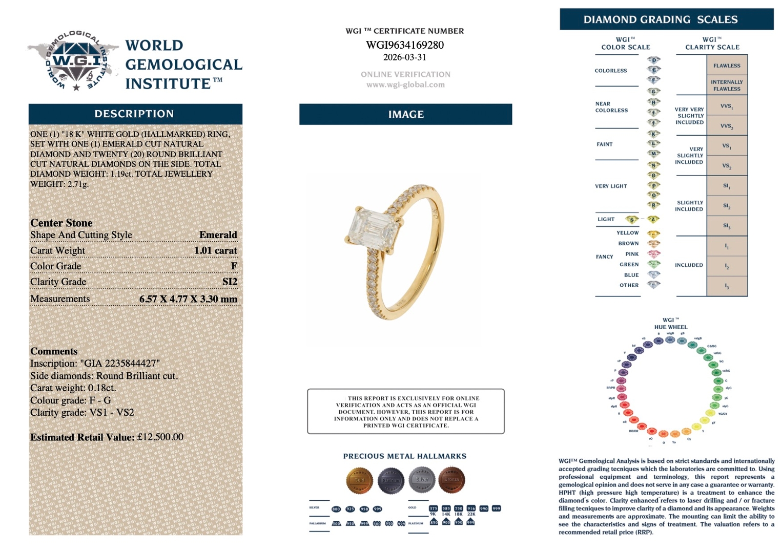 A brand-new, unused GIA-certified natural diamond solitaire engagement ring, set with a refined 1.01ct emerald-cut diamond at the centre, complemented by a delicate cluster of brilliant-cut diamonds along the shoulders, all crafted in 18ct yellow gold. The centre stone displays a bright F colour, offering a crisp and colourless appearance, while its SI2 clarity allows the distinctive step-cut facets to produce a subtle, mirror-like elegance. The shoulder diamonds, totalling 0.18ct, are of higher F–G colour and VS1–VS2 clarity, adding a clean, lively brilliance that enhances the overall composition.