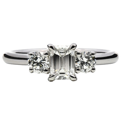 A brand-new, unused GIA-certified natural diamond three-stone cluster ring, with one emerald-cut diamond to the centre & two brilliant-cut diamonds to the sides, set in platinum.