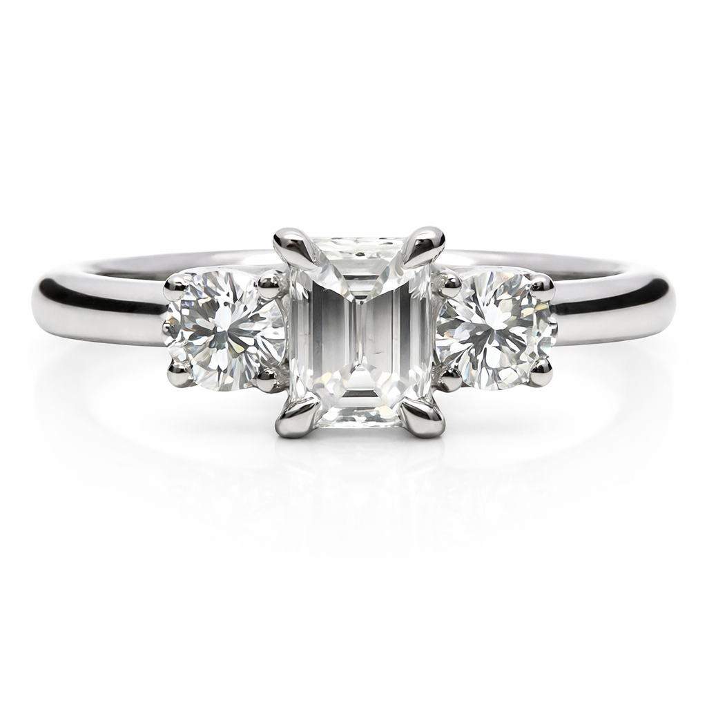 A brand-new, unused natural diamond three-stone cluster ring of refined elegance, centred by a GIA certified emerald-cut diamond weighing 0.47ct. Graded F for colour and SI1 for clarity, the centre stone offers a bright, well-balanced appearance with clean step facets that emphasise symmetry and understated sophistication. Two brilliant-cut diamonds positioned to either side, with a combined weight of 0.31ct, introduce lively contrast and visual balance, enhancing the overall presence while allowing the emerald cut to remain the focal point.