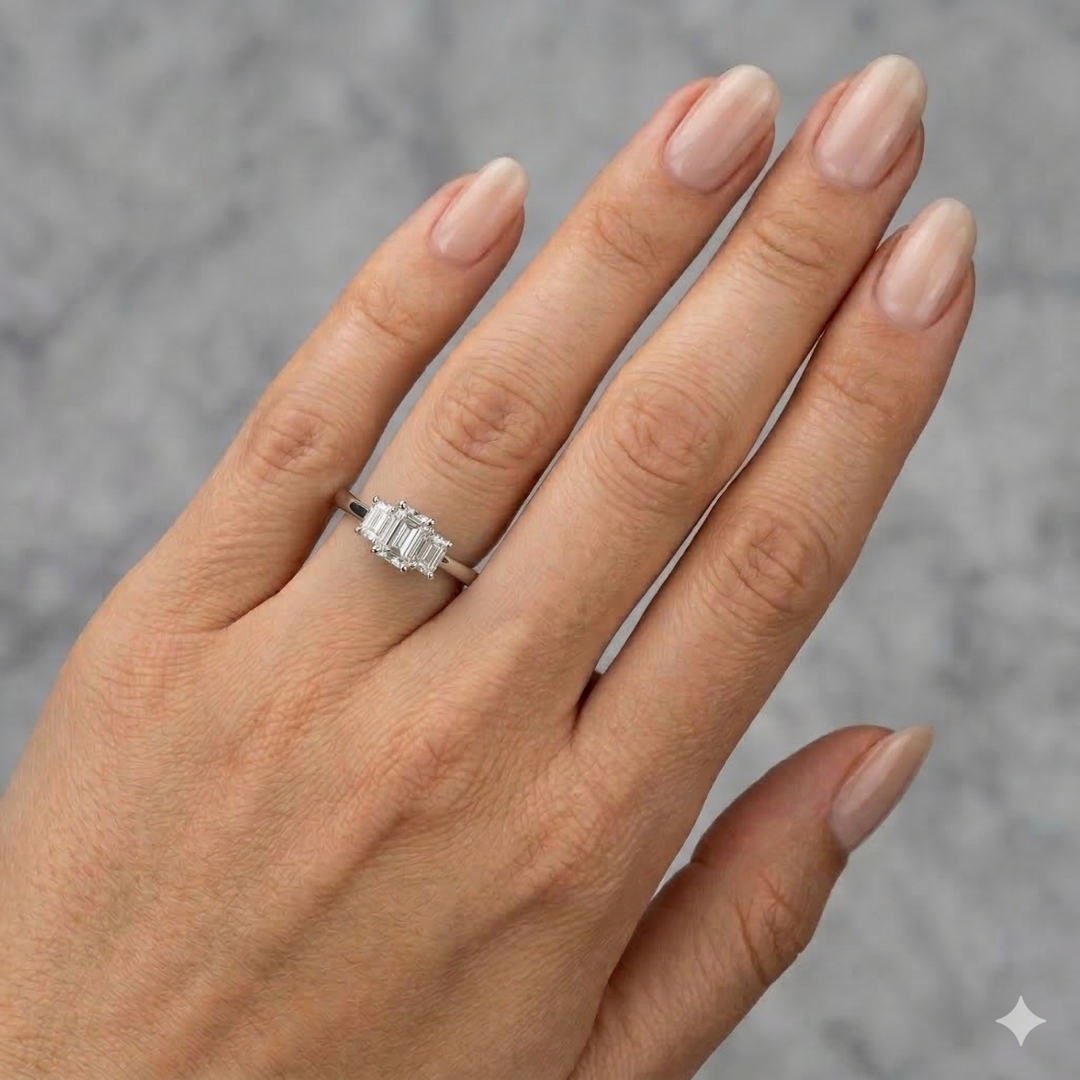 A brand-new, unused GIA-certified natural diamond three-stone cluster ring that brings together refined geometry, exceptional clarity, and the enduring desirability of genuine diamonds. Set with three emerald-cut natural diamonds totalling 1.31ct in D–E colour and VS clarity, the ring offers a bright, sophisticated appearance with clean lines and impressive light performance. Each diamond has been chosen for its crisp transparency and elegant step-cut structure, creating a balanced trio that reflects light with subtle flashes and confident depth. The colour grades' purity enhances the stones' refinement, while VS clarity ensures the diamonds remain bright and lively from every angle. These natural diamonds command a strong premium, valued for their authenticity, rarity, and the lasting prestige that continues to define naturally formed stones in fine jewellery.