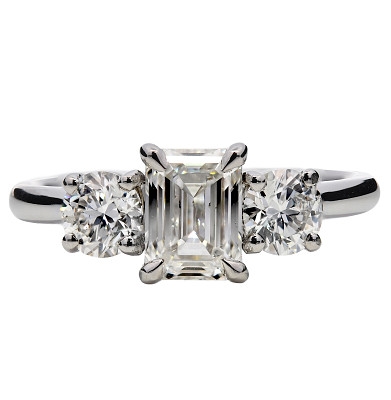 A brand-new, unused GIA-certified natural diamond three-stone cluster ring, with one emerald-cut diamond to the centre & two brilliant-cut diamonds to the sides, set in platinum.