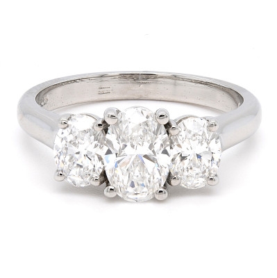 A brand-new, unused GIA-certified natural diamond three-stone cluster ring, set in platinum and featuring three beautifully matched oval-cut diamonds with a combined weight of 1.60ct. The elegant oval silhouette enhances finger coverage while maintaining refined proportions, creating a balanced and timeless profile. Each diamond has been carefully selected to ensure harmony in shape and brilliance, allowing the trio to sit seamlessly together in a classic yet impactful design.