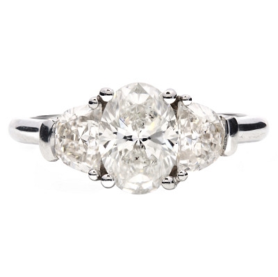 A brand-new, unused GIA-certified natural diamond three-stone cluster ring, with one oval-cut diamond to the centre & two half-moon-cut diamonds to the sides, set in platinum.