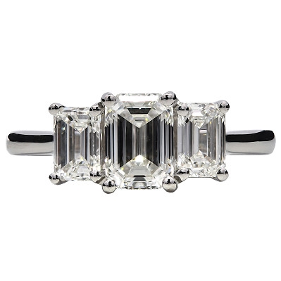 The three-stone arrangement offers both visual balance and meaningful symbolism, traditionally representing past, present and future. Crafted in platinum, the setting provides exceptional durability and a naturally white finish that enhances the diamonds’ clarity and structure. The cool tone of platinum perfectly complements the geometric precision of the emerald cuts, ensuring a timeless aesthetic suited to both classic and contemporary tastes.