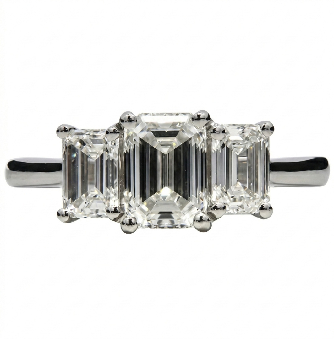 Crafted in platinum, the setting provides enduring strength and a naturally bright tone that enhances the diamonds’ superior colour grade. The clean geometry of the emerald cuts delivers understated sophistication, while the three-stone arrangement offers timeless symbolism and elegant finger coverage without excess.