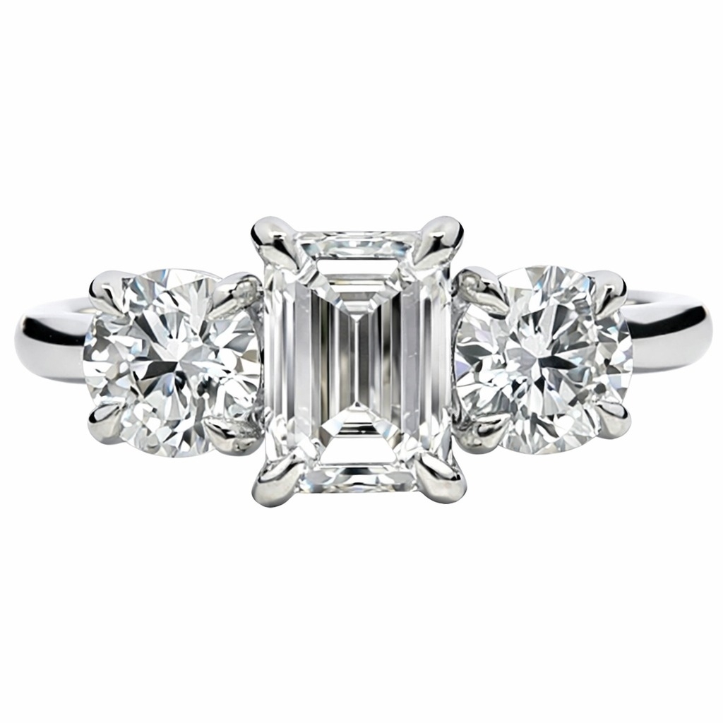 A brand-new, unused natural diamond three-stone cluster ring of commanding presence, centred around a GIA-certified emerald-cut diamond weighing 1.01ct. Graded F for colour and SI1 for clarity, the centre stone presents a bright, refined appearance with crisp step facets that emphasise structure, symmetry, and elegant restraint rather than excessive sparkle. Two brilliant-cut diamonds, positioned on either side, add a combined weight of 0.81 ct, creating contrast and lively brilliance while maintaining visual balance across the setting.