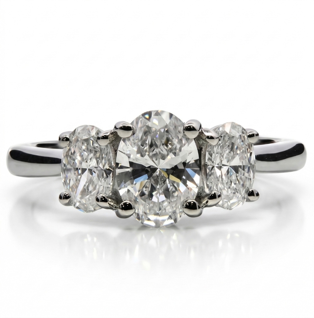 A brand-new, unused GIA-certified natural diamond three-stone eternity ring, set with three beautifully matched oval-cut diamonds totalling 1.31ct. Each stone has been selected for its lively brilliance and elegant proportions, with the oval cut offering exceptional light return while creating a flattering elongated appearance across the finger. Graded E colour and SI1 clarity, the diamonds display outstanding whiteness within one of the highest colour classifications, delivering crisp brightness and impressive sparkle.