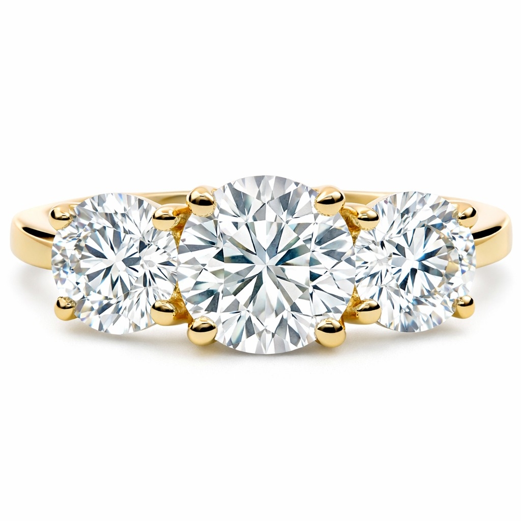 A brand-new, unused GIA-certified natural diamond three-stone eternity ring, with three brilliant-cut diamonds, set in 18ct yellow gold.