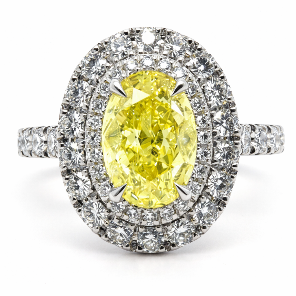 Encircling the centre diamond is a double halo of brilliant-cut natural white diamonds, extending seamlessly along the shoulders and adding a further 1.27ct of diamond weight. The bright white diamonds create a dramatic contrast against the vivid yellow core, intensifying its colour while introducing exceptional fire and scintillation from every angle. The platinum setting provides a strong, refined framework that supports the design with lasting durability and a clean, contemporary finish.