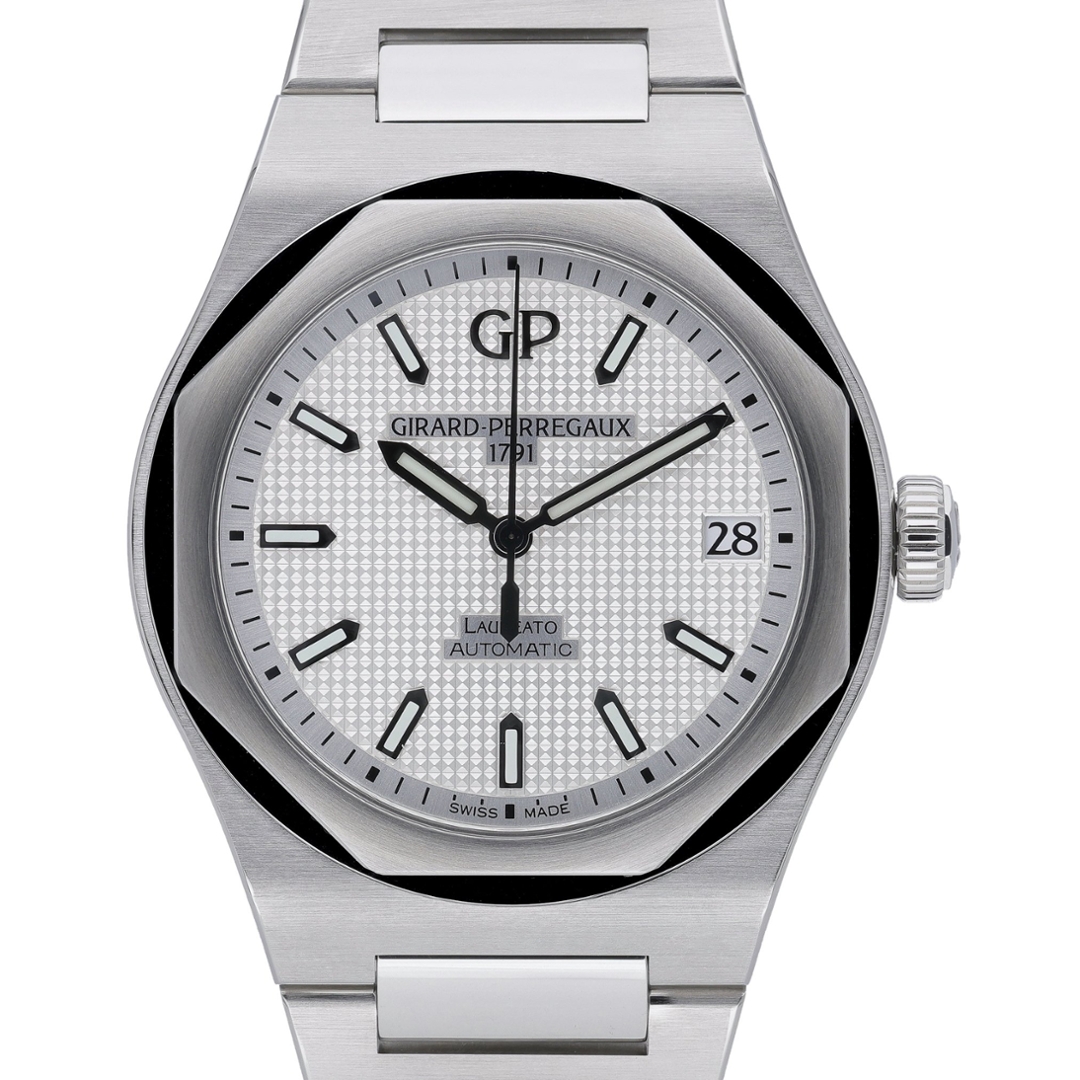 A Girard-Perregaux Laureato watch, expertly crafted from stainless steel and featuring a striking silver Clous de Paris-patterned dial. Model number 81010-11-131-11A, this 2024 example exemplifies the signature harmony of sport and elegance that defines the Laureato collection — a design first introduced in 1975 and now revered as one of the most distinctive luxury sports watches ever made.