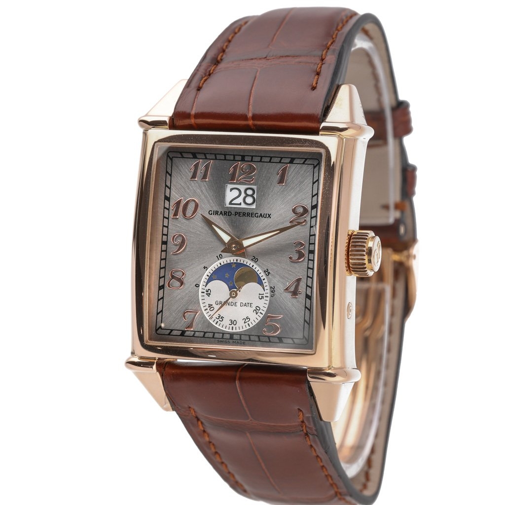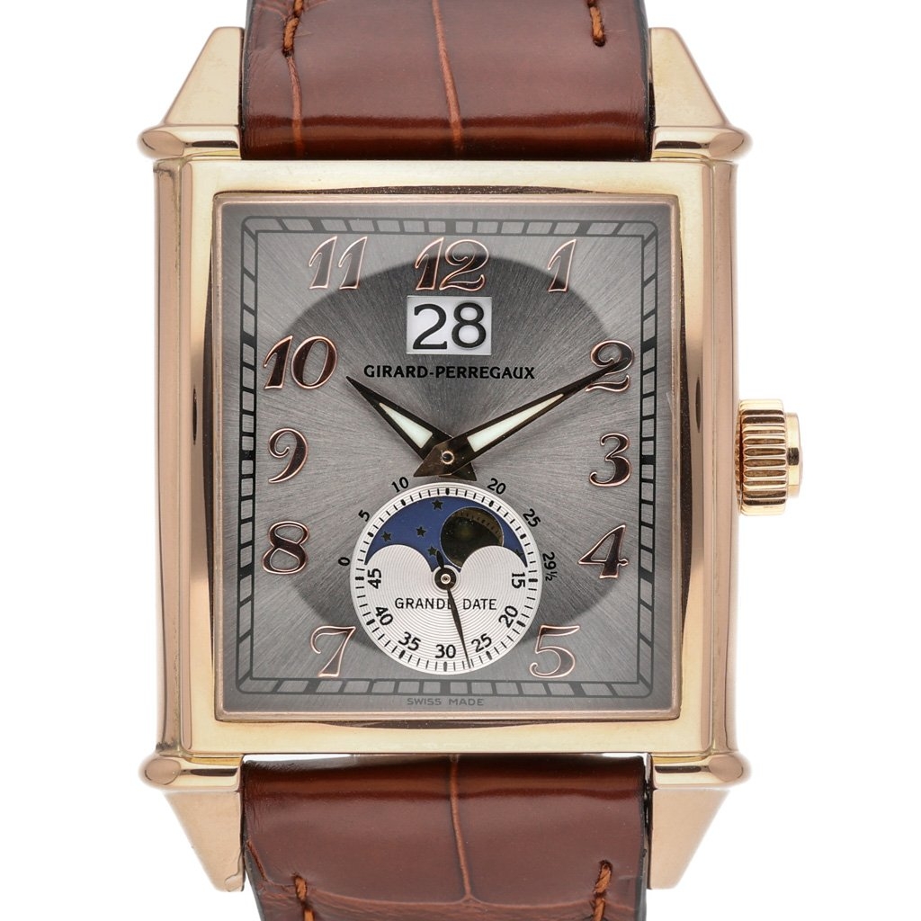 A Girard-Perregaux Vintage 1945 watch presented on a rich brown leather strap, complemented by an elegant 18ct rose gold case and matching clasp. Model number 2580, this 2004 example perfectly captures the art deco-inspired design language that defines the Vintage 1945 collection. Powered by an automatic Girard-Perregaux in-house movement, it offers reliable precision and smooth performance, embodying the brand’s long-standing tradition of Swiss craftsmanship and technical finesse.
