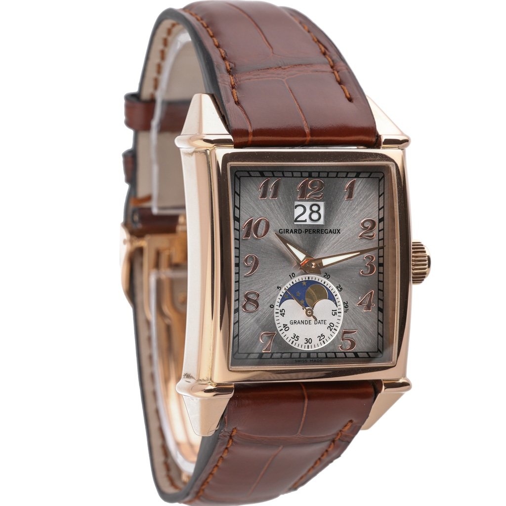 The 36mm curved rectangular case sits beautifully on the wrist, with soft lines and polished edges that highlight the warm tone of the rose gold. The slate grey dial adds depth and sophistication, featuring applied gold numerals, dauphine hands, and a discreet date display, balancing elegance with functionality. The exhibition caseback reveals the beautifully decorated movement within, showcasing Girard-Perregaux’s meticulous attention to detail.