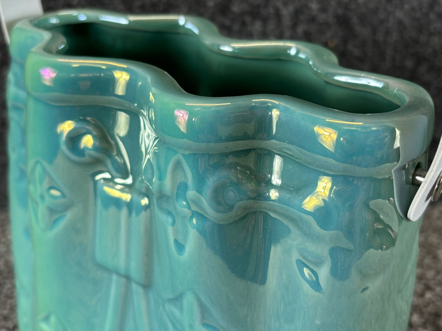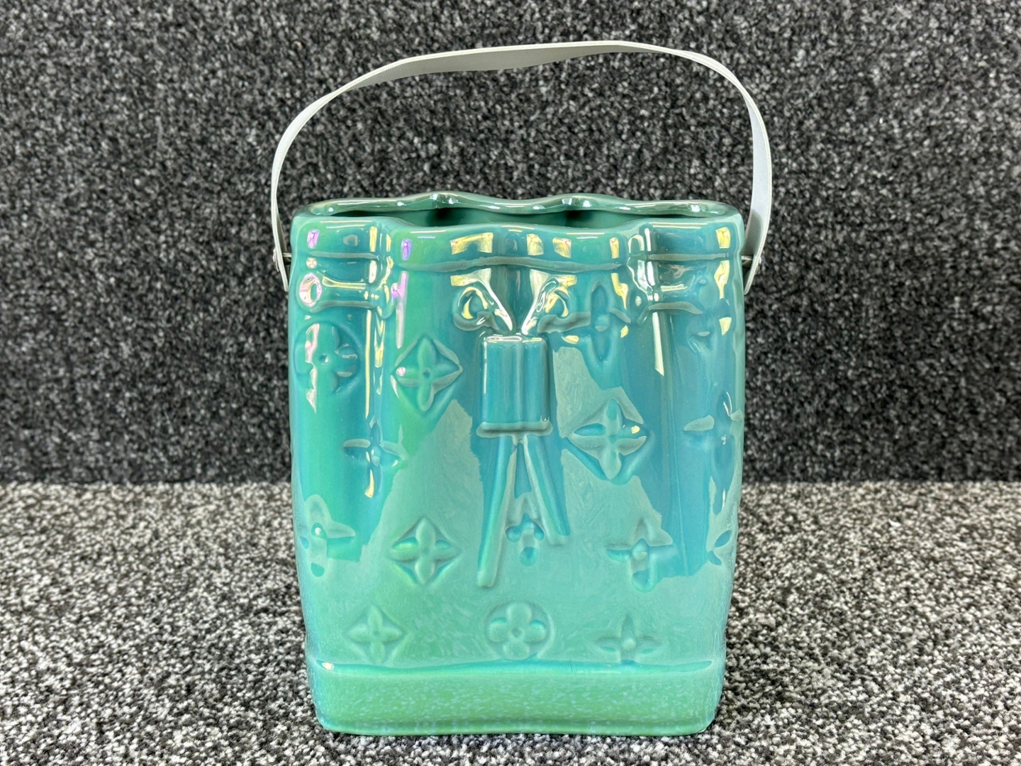 A Green Ceramic Handbag Vase with a White Handle. Approx 20cm height, 15cm width, 8cm depth.