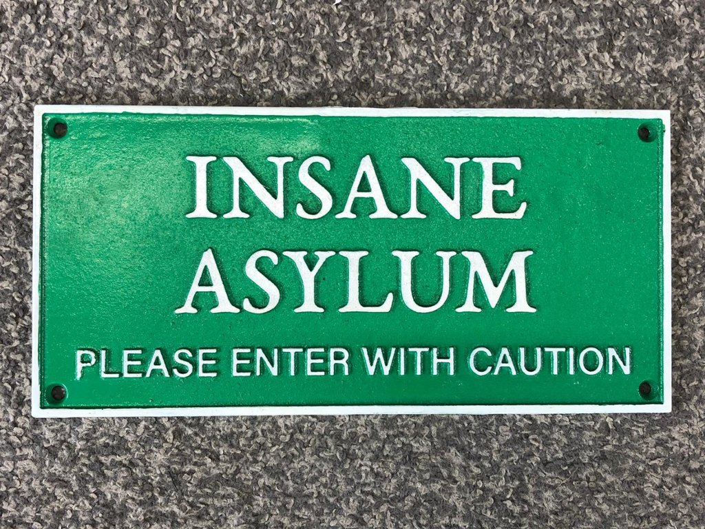 A green cast iron wall plaque with the inscription “Insane Asylum – Please Enter With Caution” is a humorous and quirky decorative piece designed to spark conversation. The bold white raised lettering stands out clearly against the vibrant green background, giving it a striking look that instantly catches the eye. Its playful warning message adds a fun, tongue-in-cheek touch to any space.