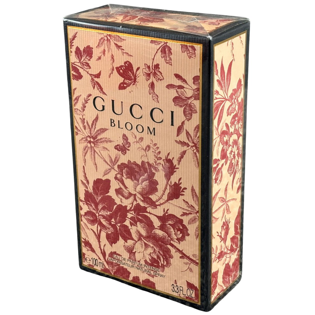 A 100ml bottle of Gucci Bloom Eau de Parfum, presented in its