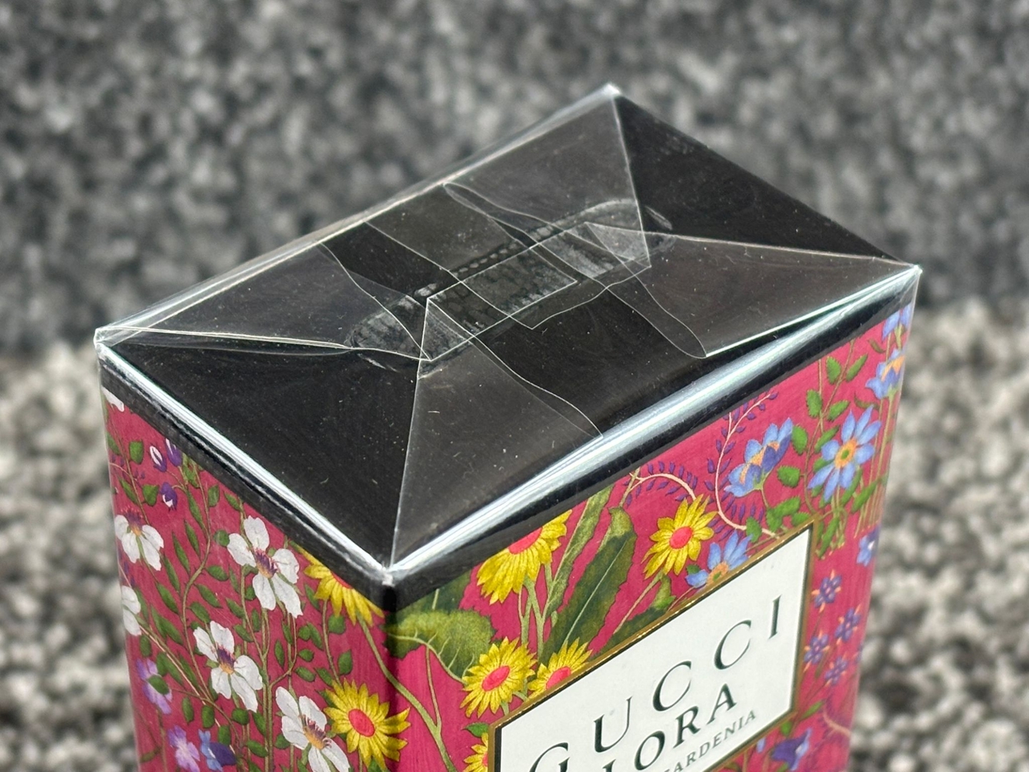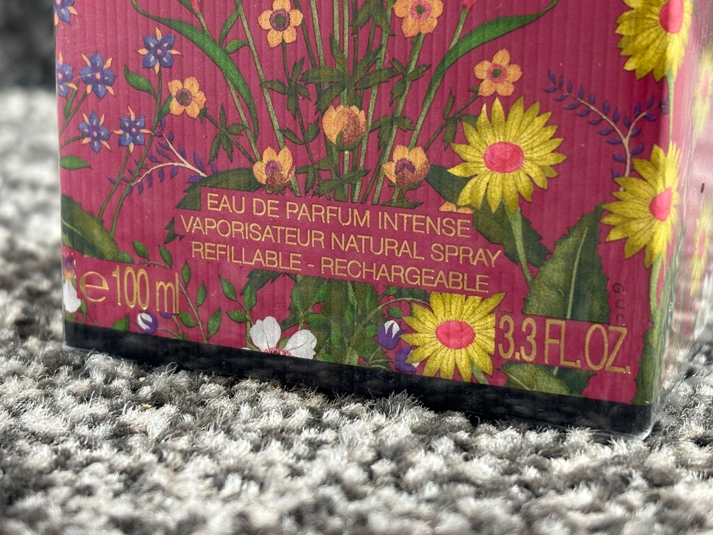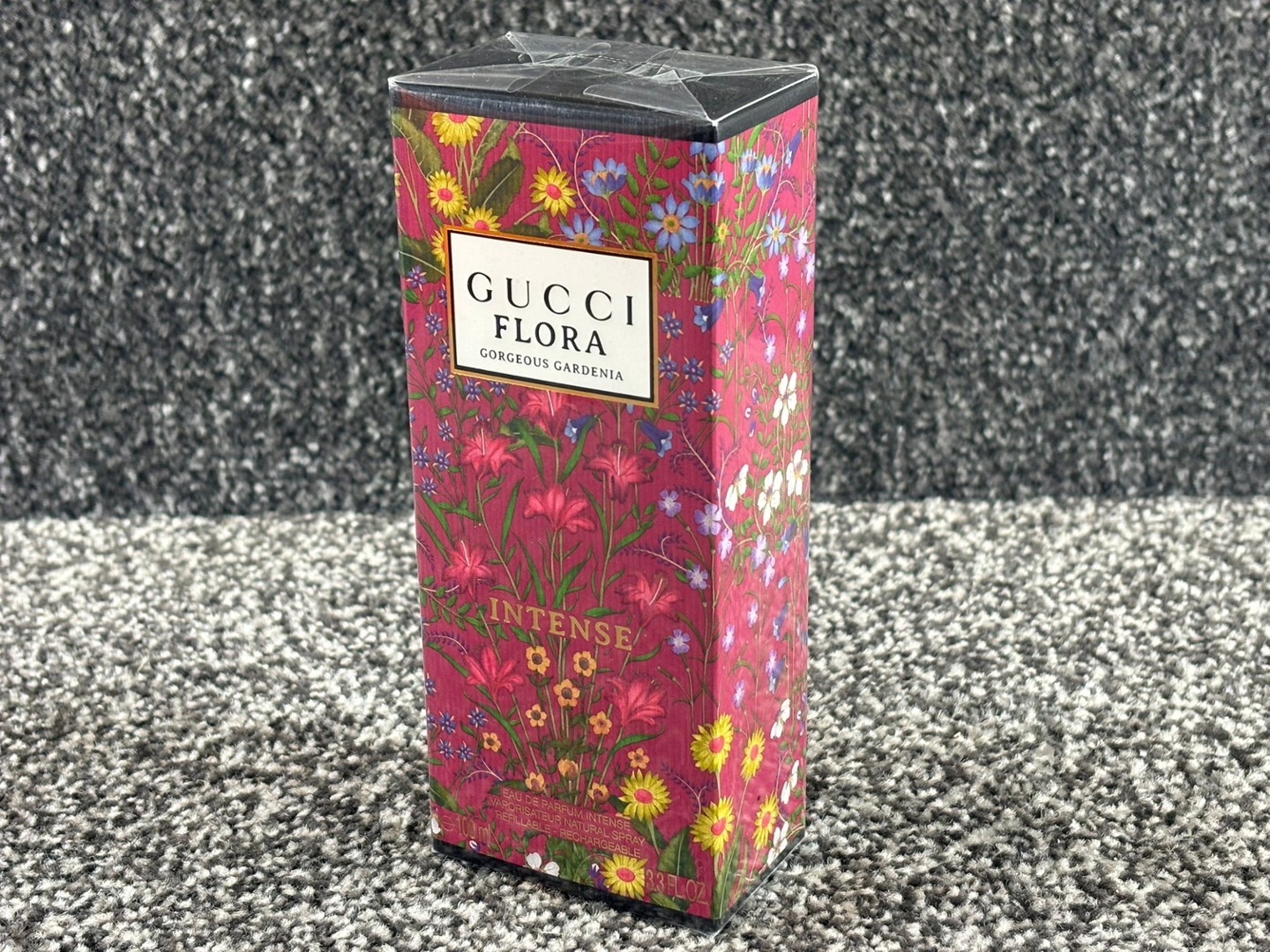 A 100ml bottle of Gucci Flora Gorgeous Gardenia Intense Eau de Parfum, presented in its original Gucci presentation box, offering a luxurious and expressive fragrance from one of the world’s most iconic fashion houses. The beautifully designed bottle, adorned with the signature Flora pattern, makes this piece instantly eye-catching and ideal for gifting or enhancing any personal perfume collection.