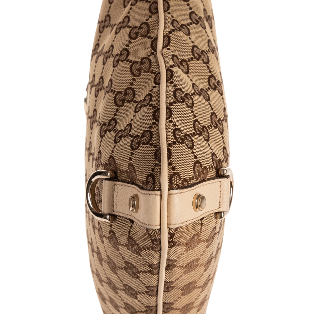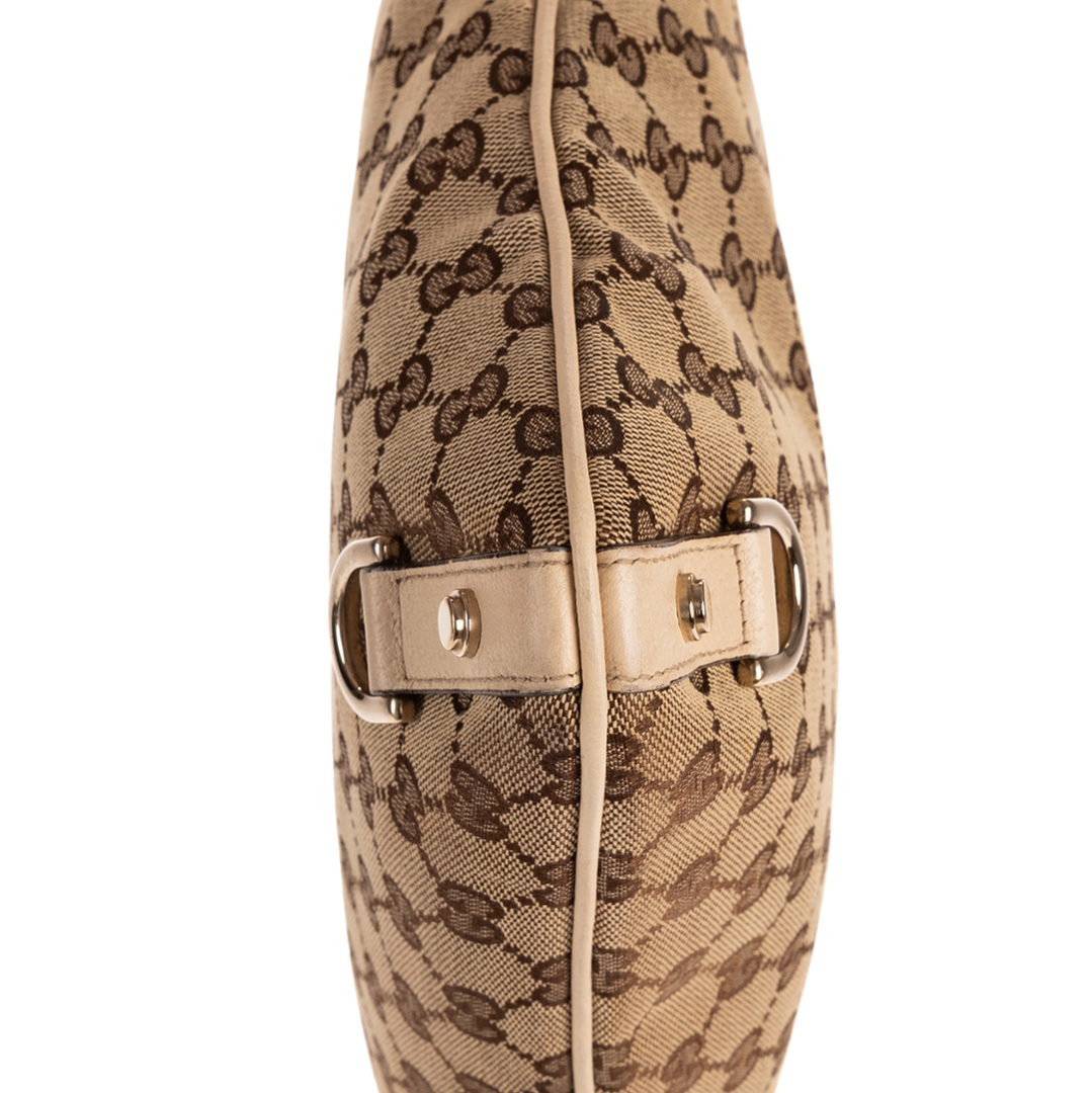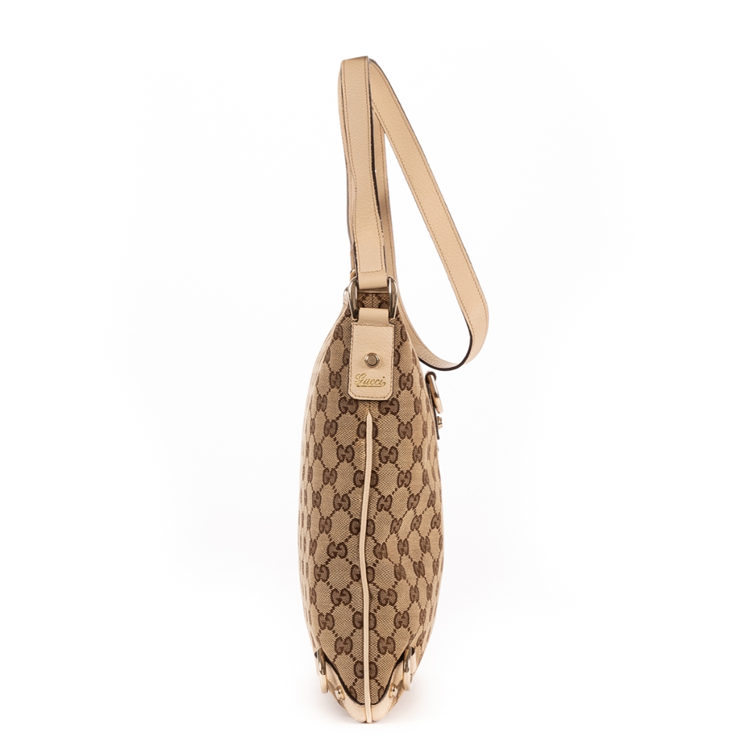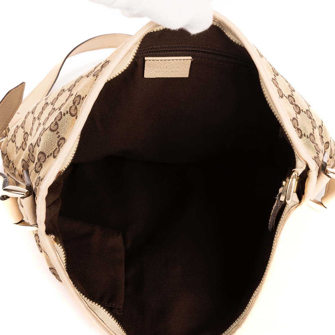 A vintage Gucci ivory and beige GG canvas Abbey D-Ring Messenger bag, featuring the house’s signature monogram pattern in a warm, neutral palette. The design is complemented by smooth ivory calf leather trim, creating a refined contrast that enhances its classic appeal. Finished with gold-tone hardware and the iconic front D-ring detail, this piece reflects Gucci’s recognisable early 2000s aesthetic with effortless sophistication.