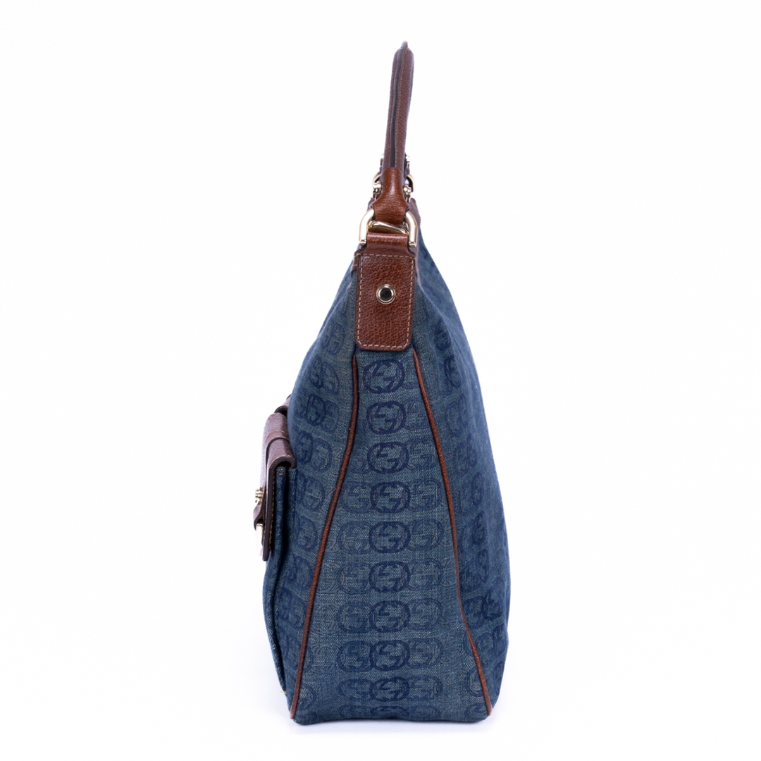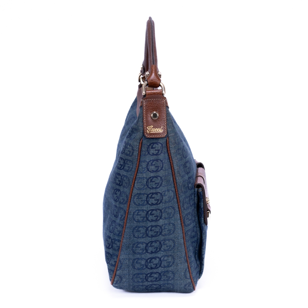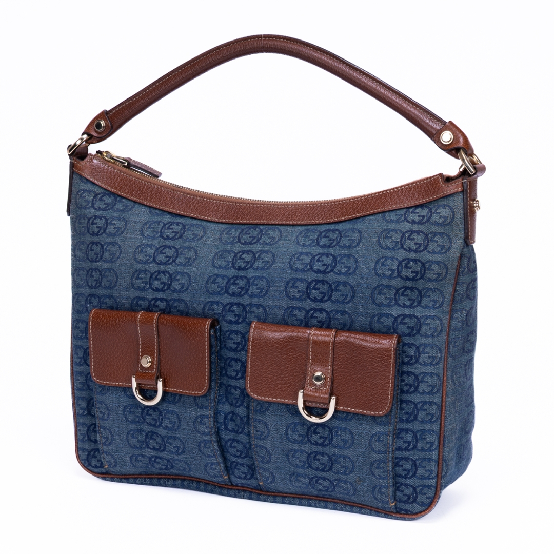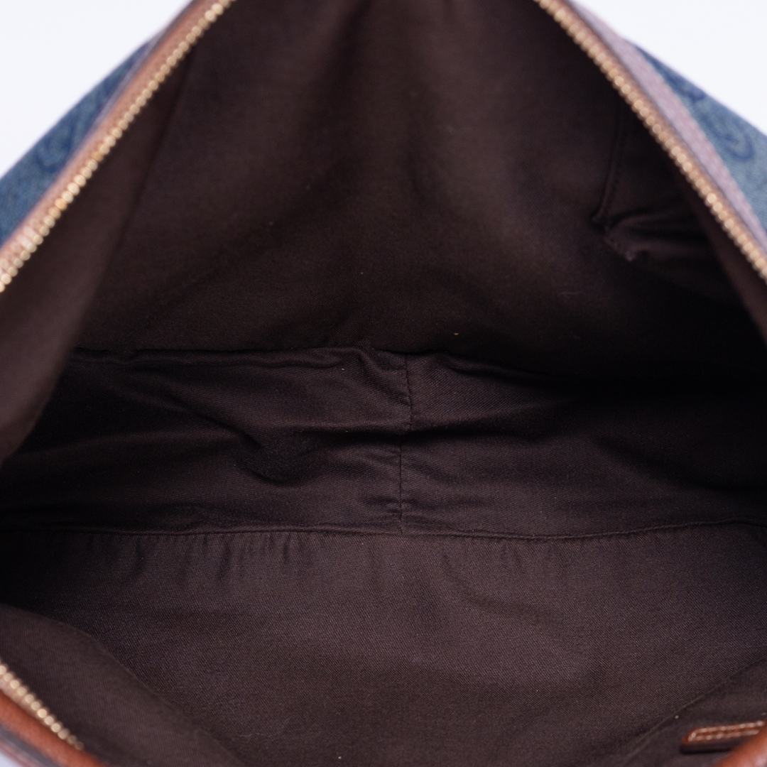 A vintage Gucci brown/blue canvas Abbey Pocket Hobo bag with a certificate of authenticity. Approximately 27cm height, 32cm width.