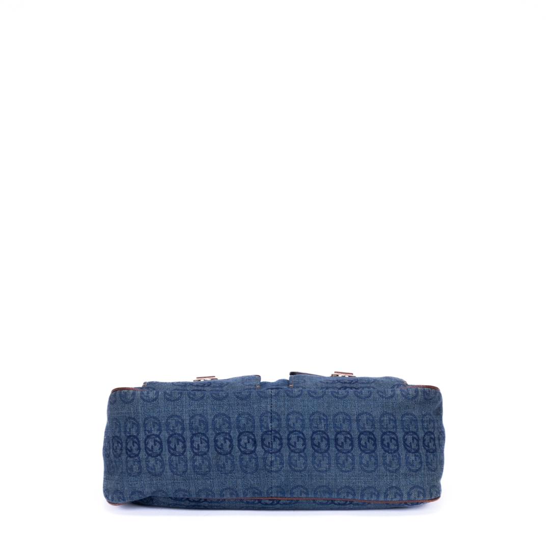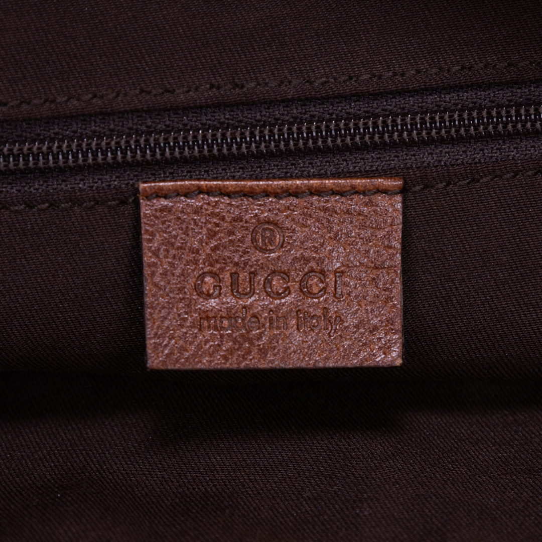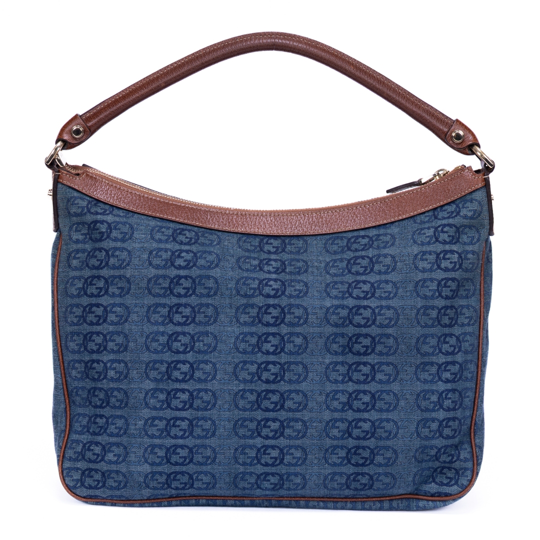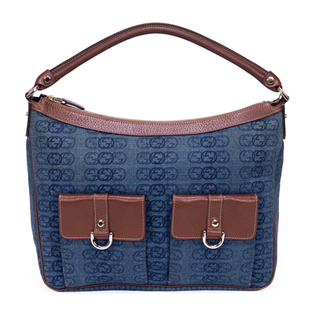 A vintage Gucci brown/blue canvas Abbey Pocket Hobo bag with a certificate of authenticity. Approximately 27cm height, 32cm width.