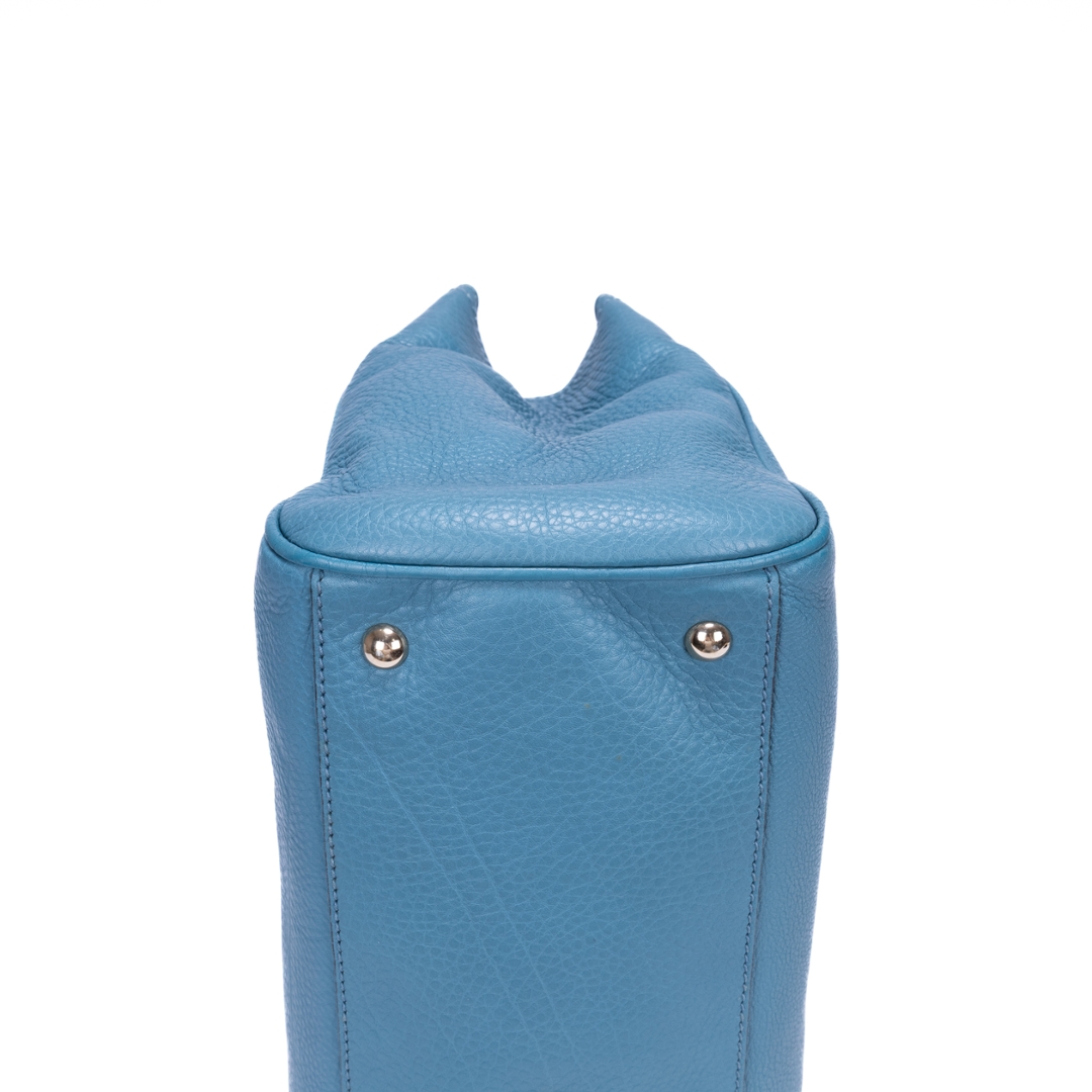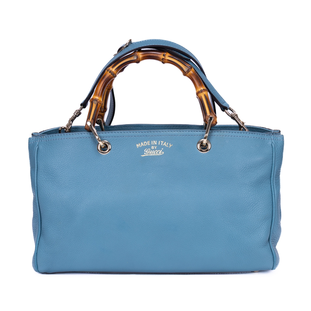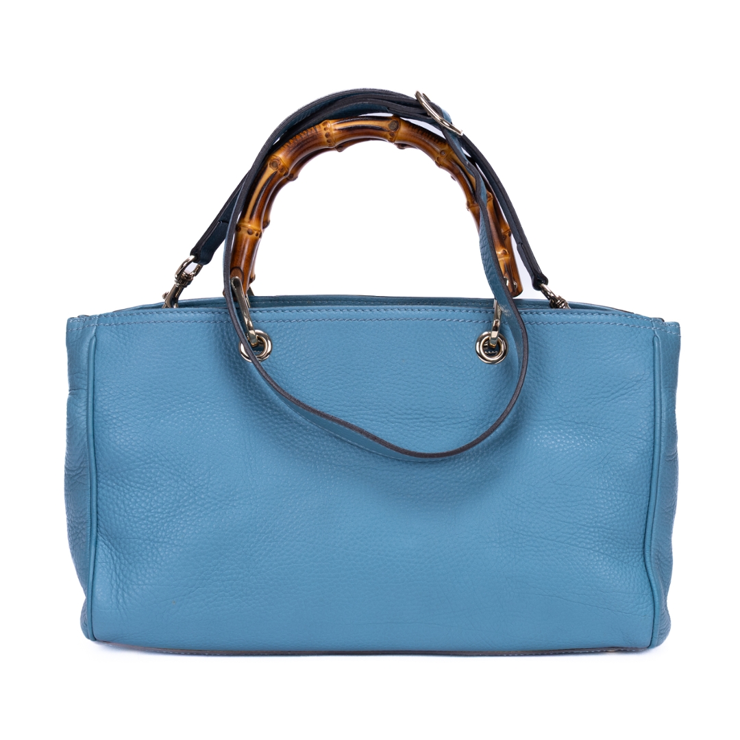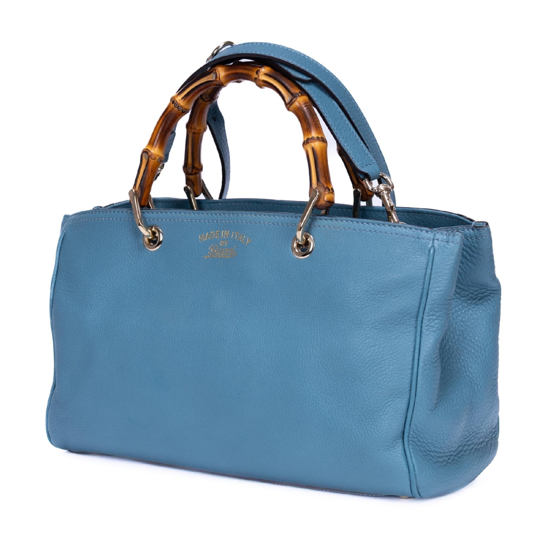 A vintage Gucci blue calf leather Bamboo Tote bag with a certificate of authenticity, Approximately 20cm height, 33cm width.