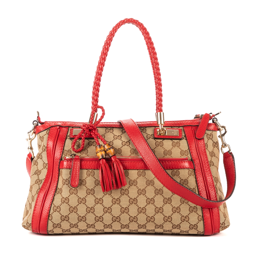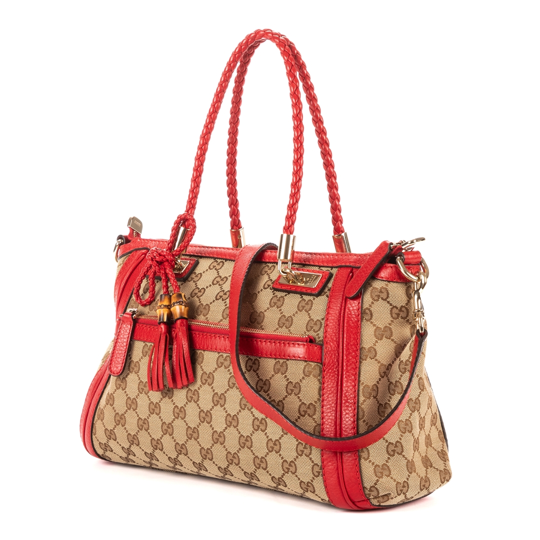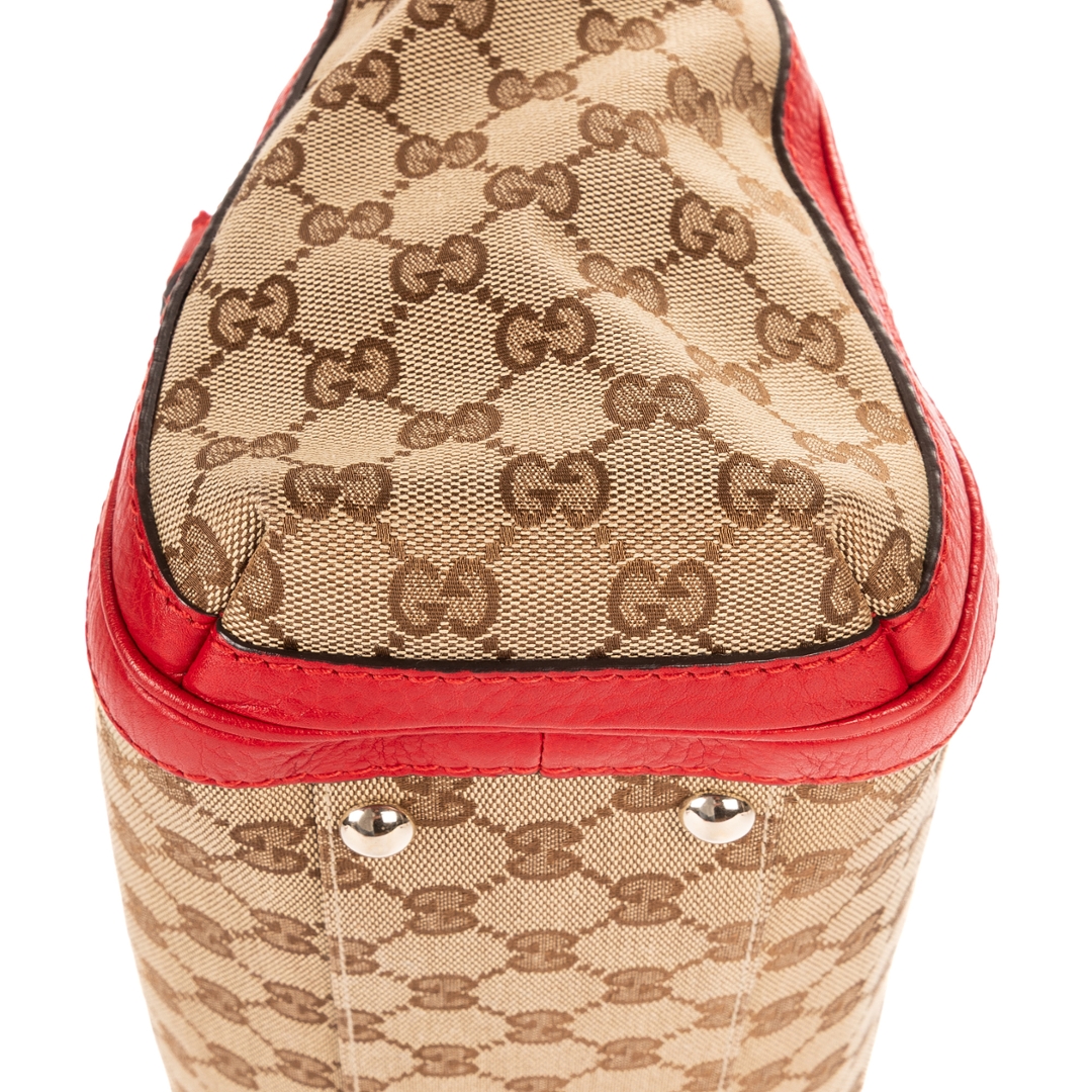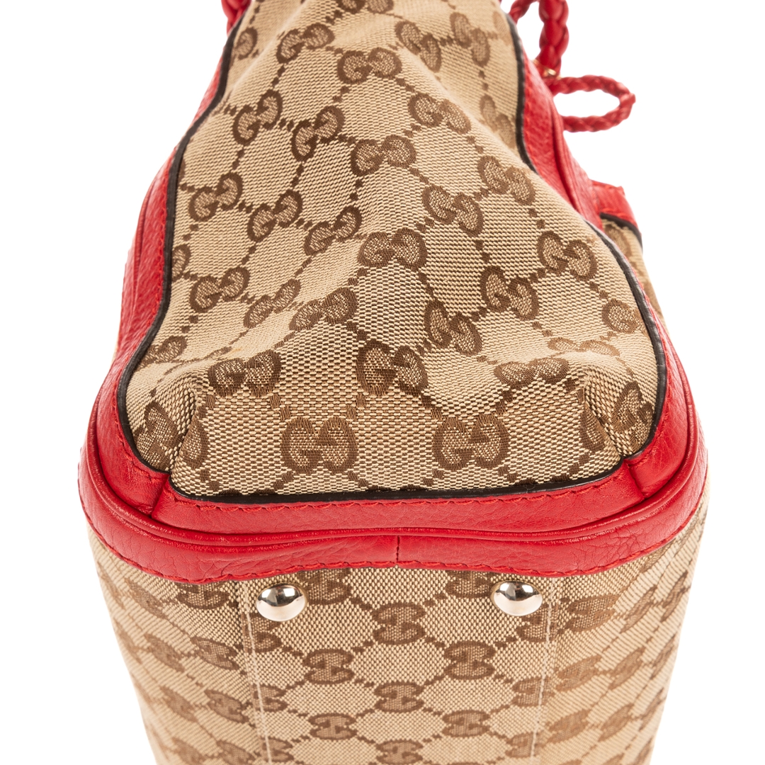A vintage Gucci beige and red canvas Bella Satchel bag, showcasing the house’s iconic GG monogram set against a classic neutral canvas. The design is elevated by bold red leather trim, creating a striking contrast that enhances its recognisable aesthetic. Finished with gold-tone hardware and signature tassel detailing with bamboo accents, this piece reflects Gucci’s distinctive blend of heritage and modern style.
