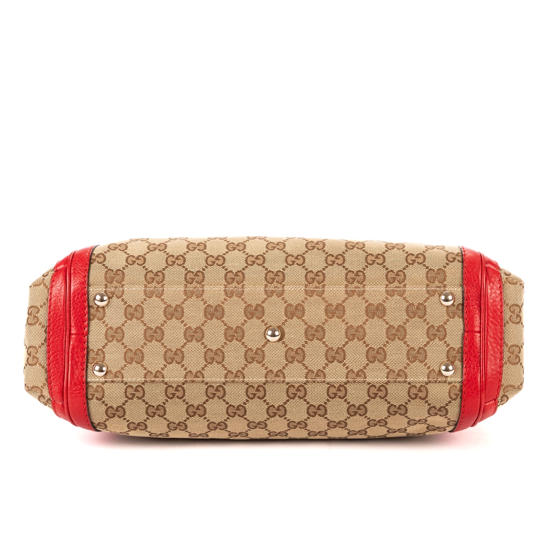 A vintage Gucci beige/red canvas Bella Satchel bag with a certificate of authenticity, Approximately 32cm height, 38cm width.