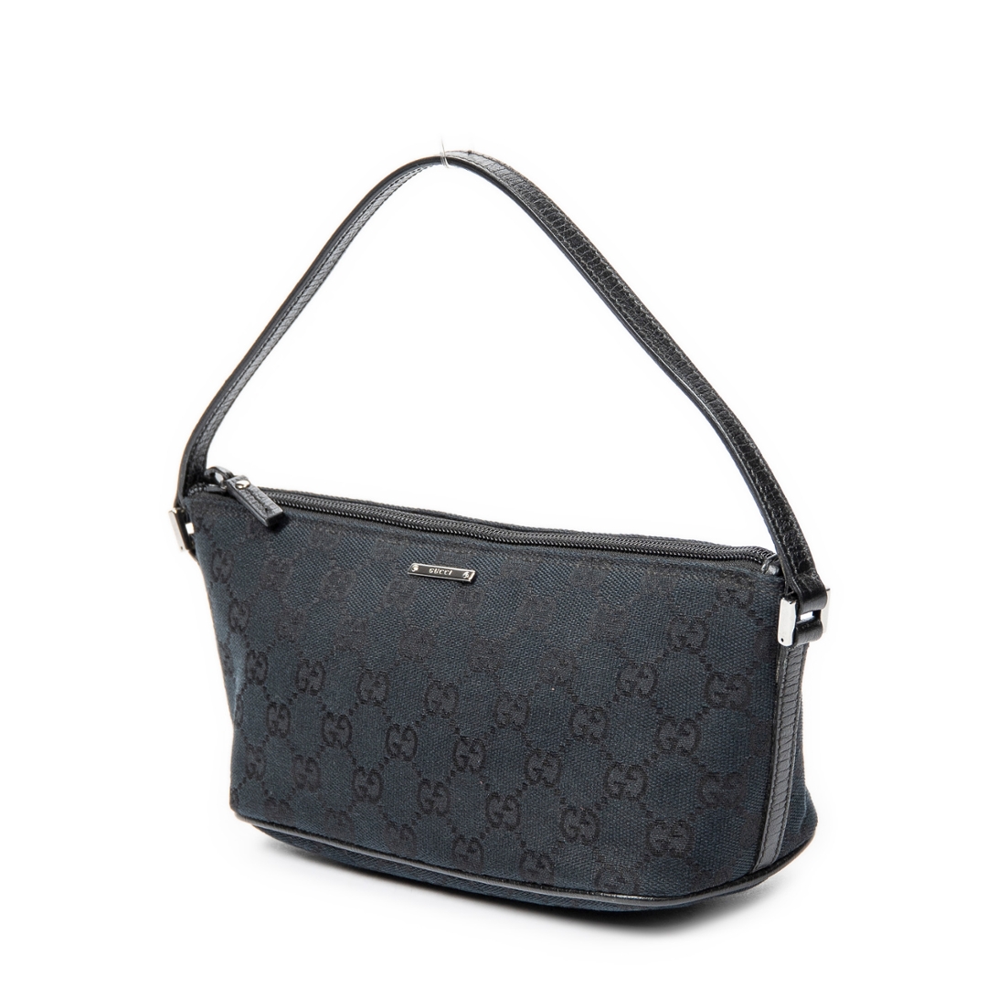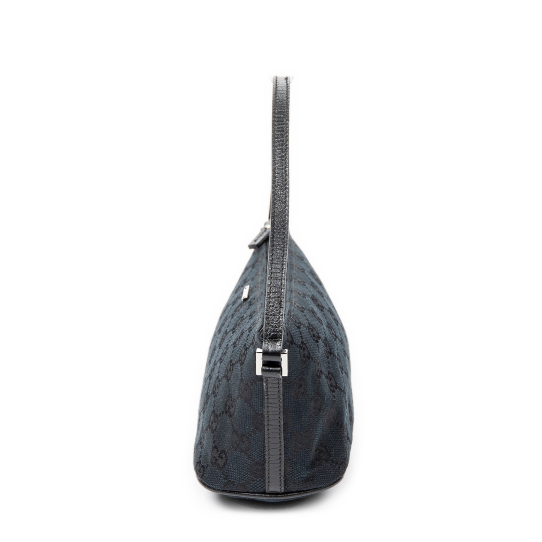 A vintage Gucci black canvas Boat Pochette bag, featuring the house’s iconic GG monogram woven subtly throughout the fabric. The streamlined silhouette is complemented by black leather trim, creating a clean and understated contrast that enhances its timeless appeal. Finished with a minimal Gucci plaque to the front, the design remains refined and effortlessly versatile.