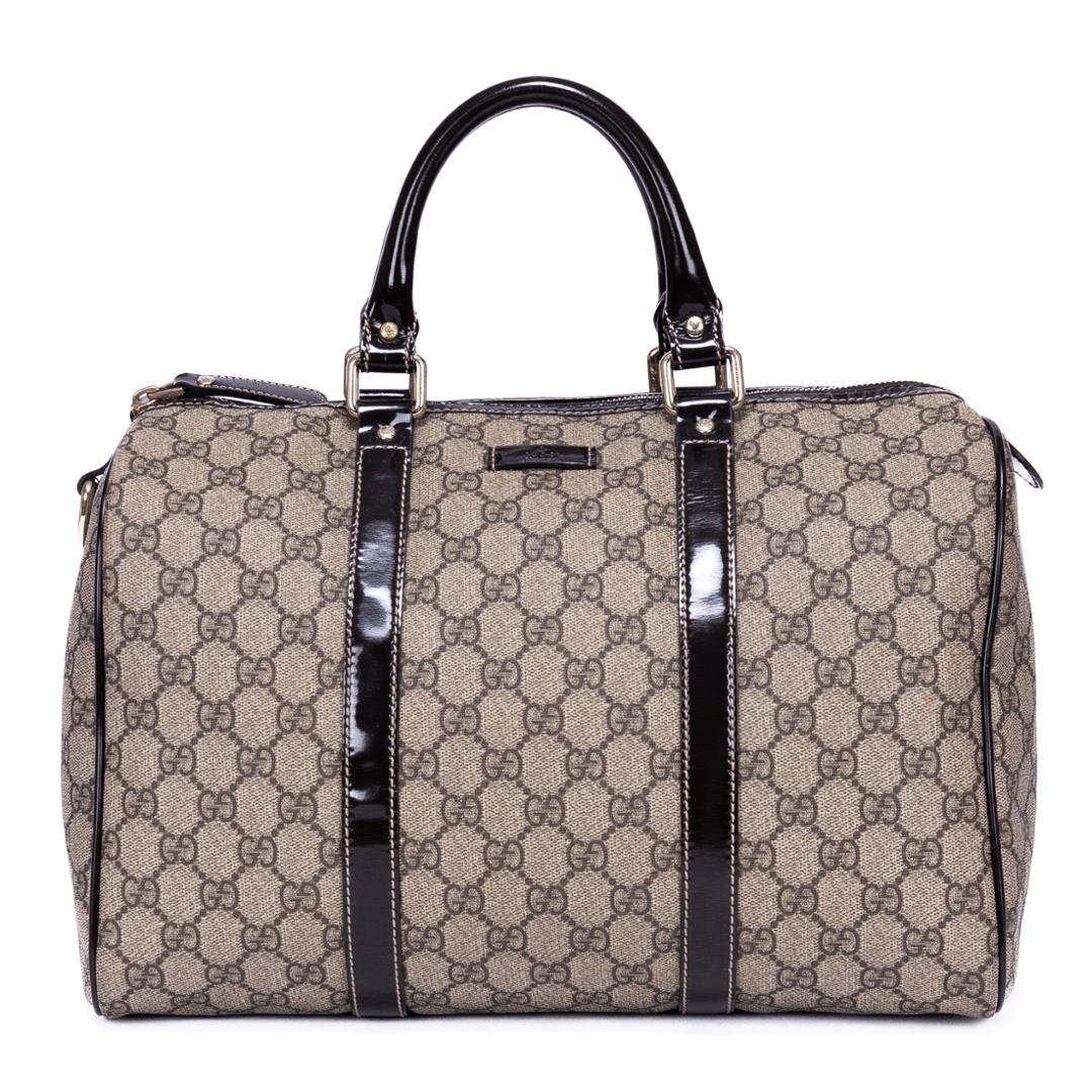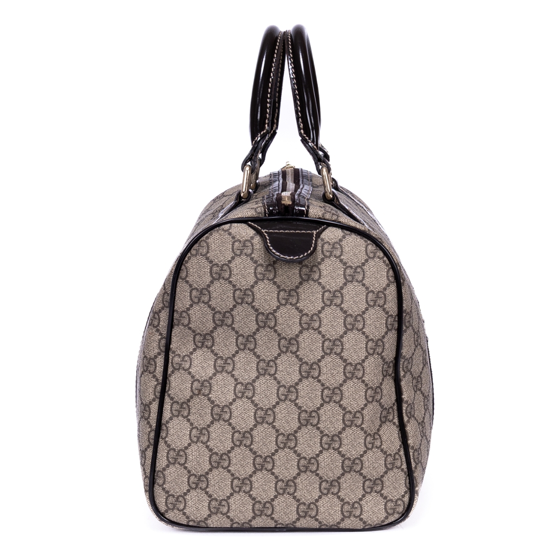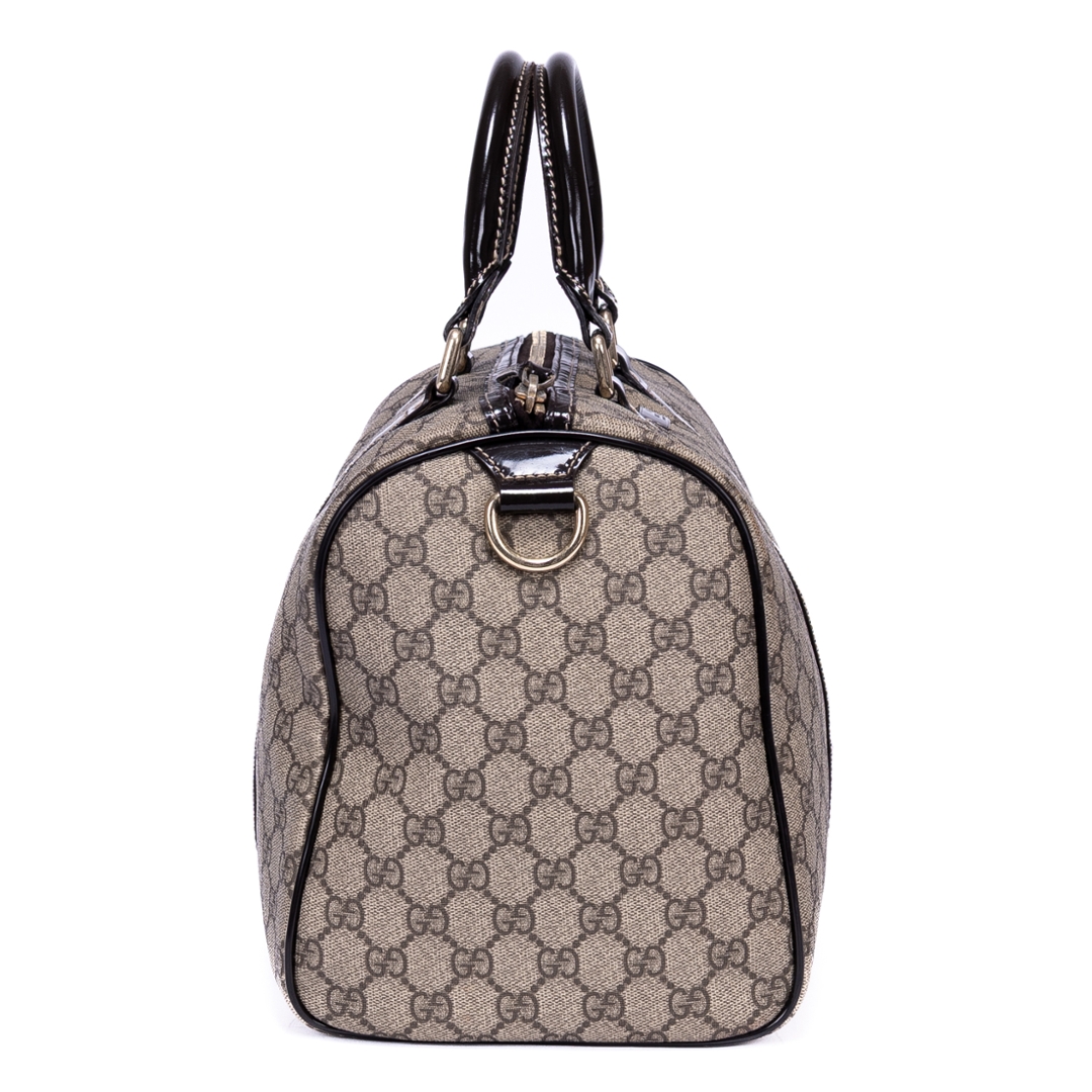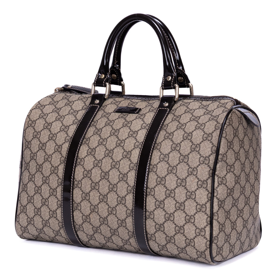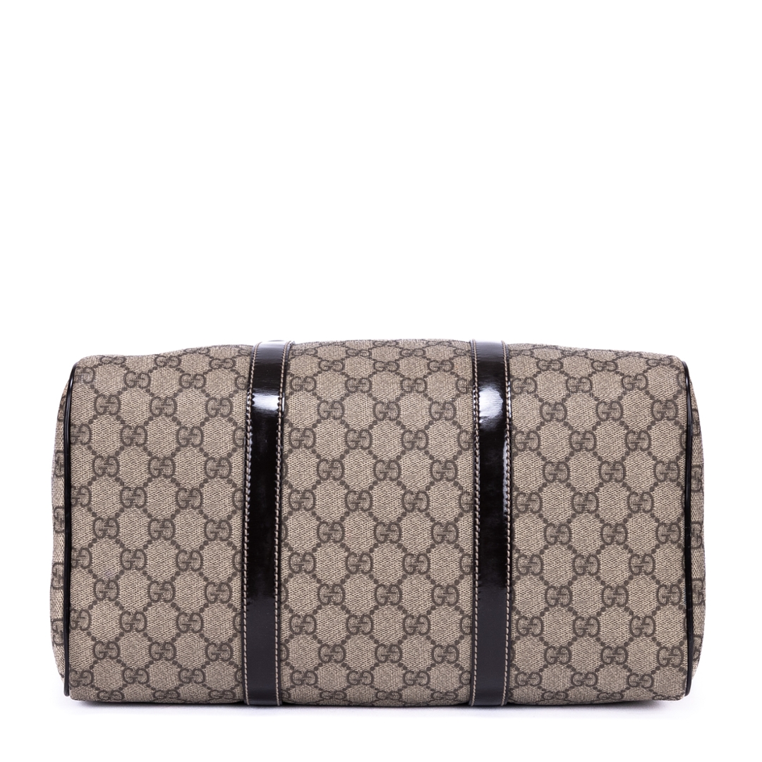 A vintage Gucci beige/dark brown coated canvas Boston bag with a certificate of authenticity. Approximately 21cm height, 32cm width.