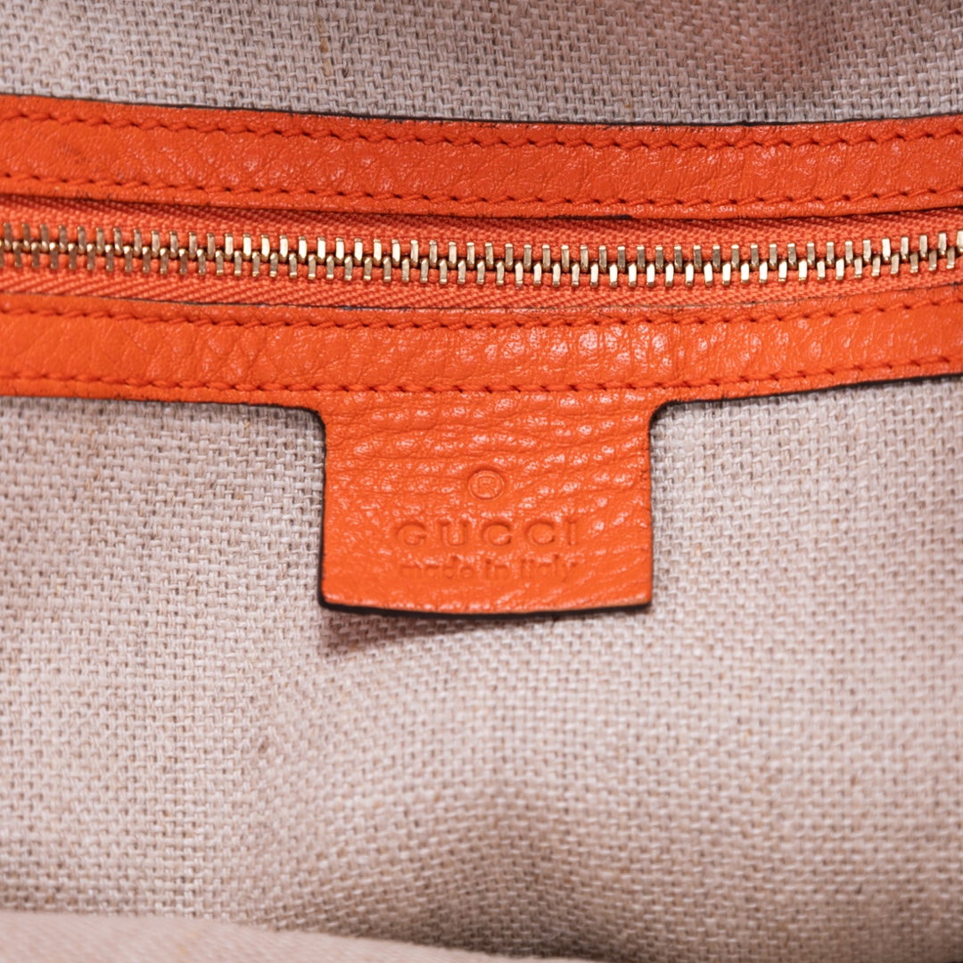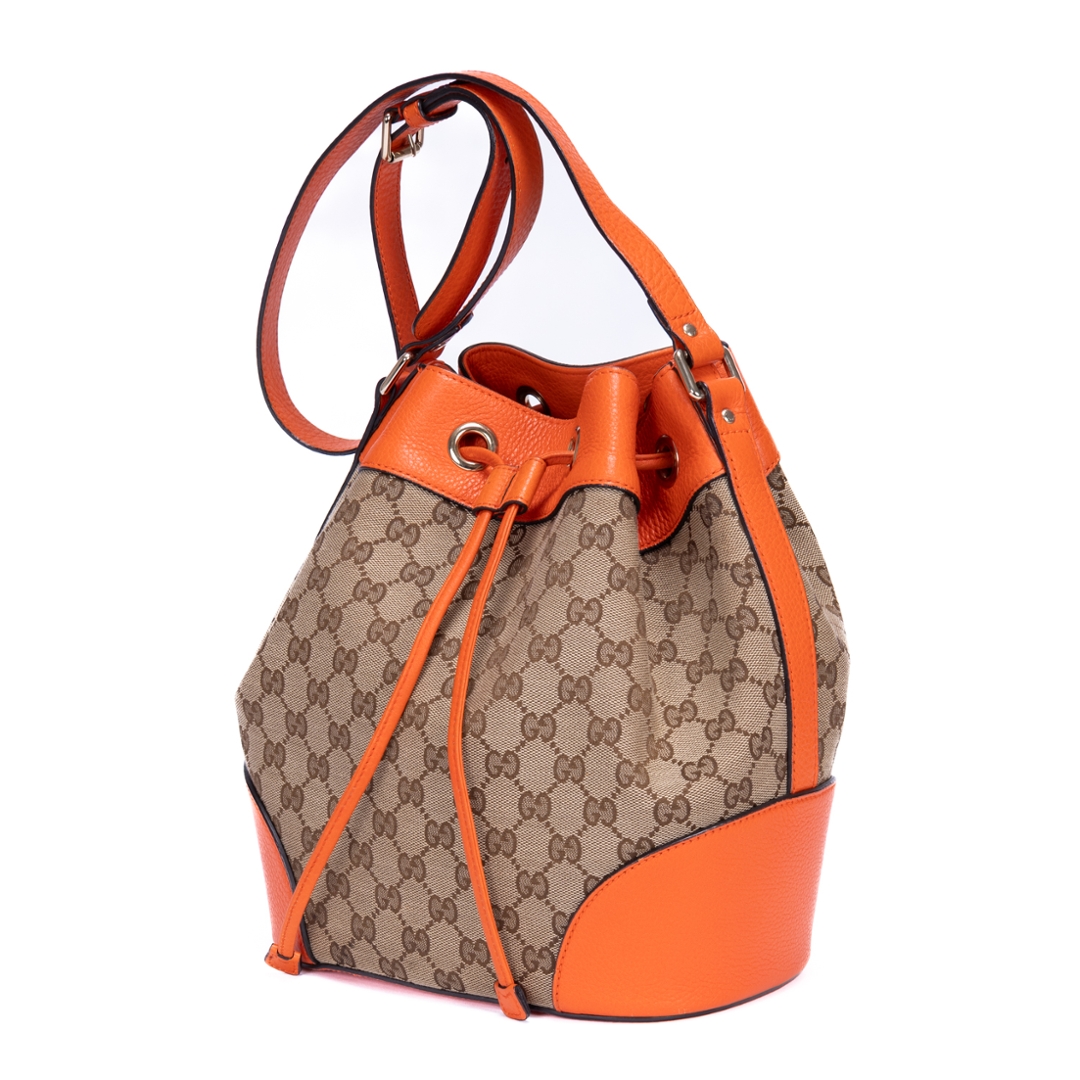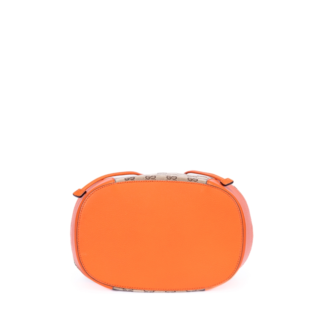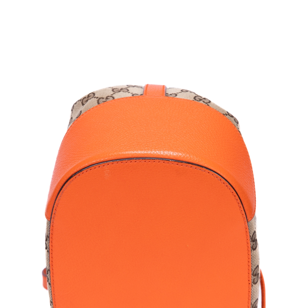 A vintage Gucci beige and orange calf leather Bucket Trim bag, showcasing the house’s iconic GG monogram canvas paired with bold orange leather accents. The softly structured bucket silhouette is enhanced by smooth leather trim and clean lines, creating a striking contrast that highlights its signature Gucci aesthetic. Finished with subtle hardware detailing, the design balances heritage style with a modern edge.