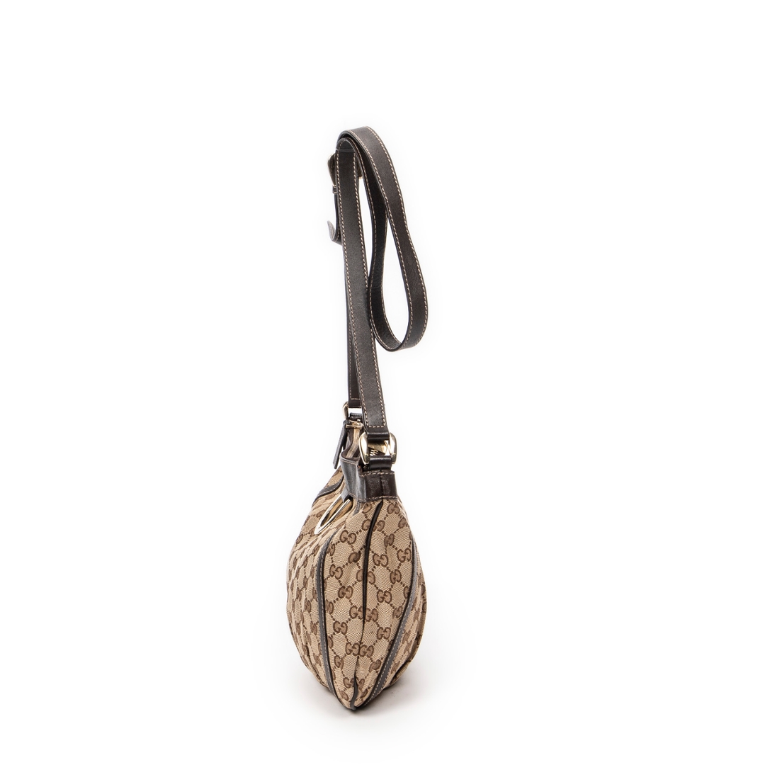 A vintage Gucci D Ring Messenger bag captures the brand’s effortless blend of Italian craftsmanship and timeless sophistication. Crafted from brown and beige GG canvas, it features rich dark brown leather trim and gold-tone hardware that accentuate its refined structure. The signature D-ring detail on the front adds a touch of understated elegance, making it instantly recognizable as a classic Gucci design.